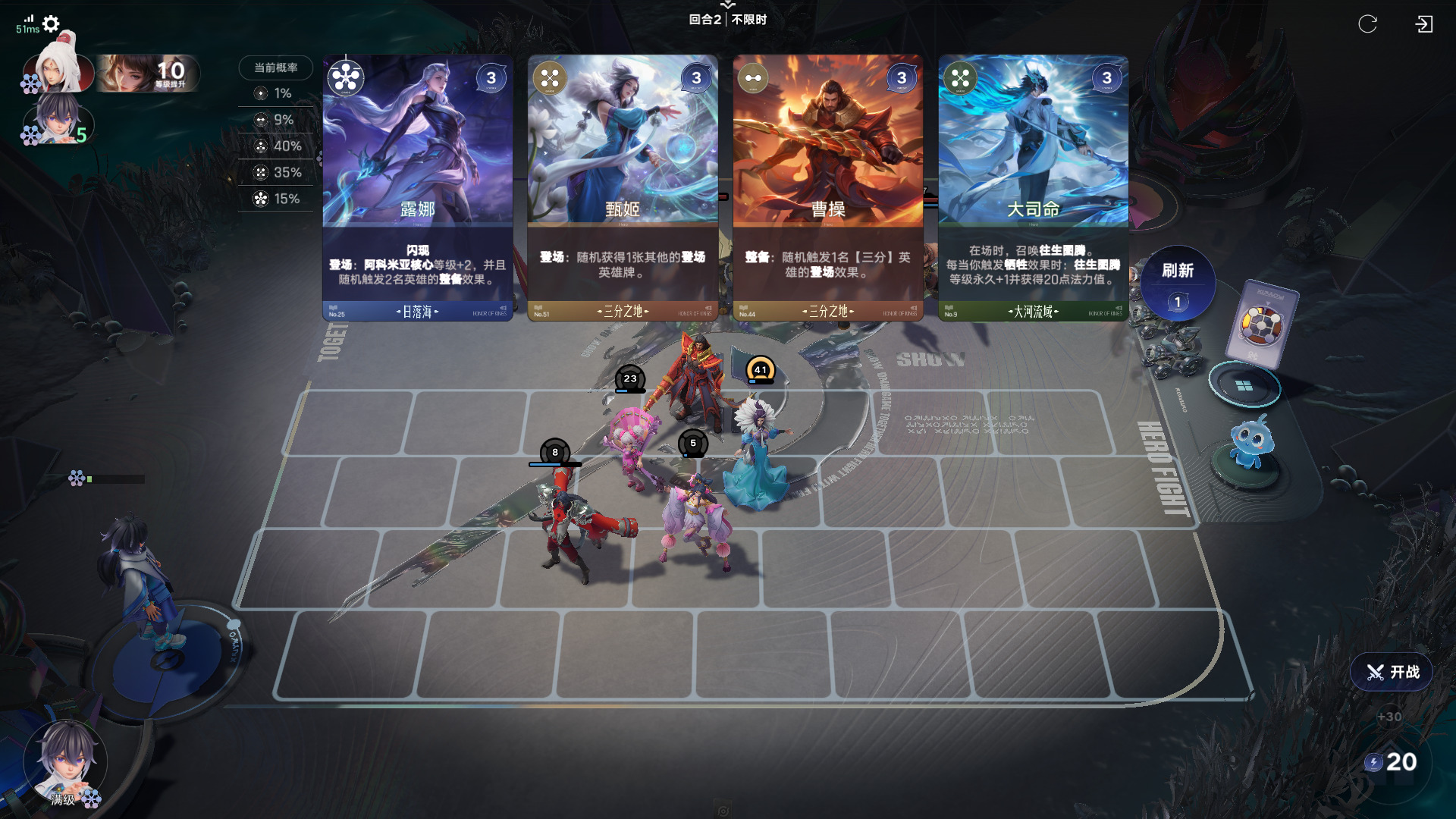 来到第二回合,商店依然是固定的,购买露娜,曹操,露娜,露娜,刷新,露娜,曹操。