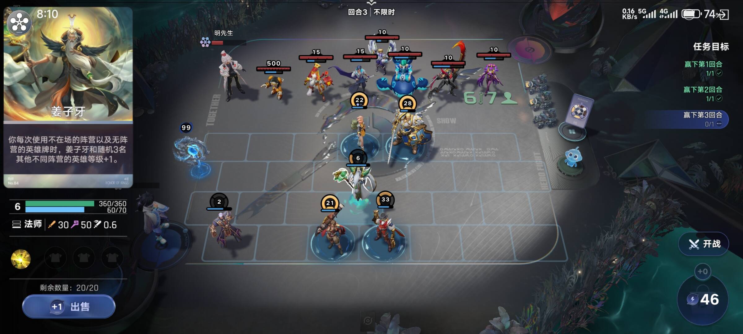 到了第三回合,这回合无论你打算拿谁来当主C,都建议买上姜子牙,并且觉醒,这样打非日落海阵营的牌也会有英雄等级提升的收益,最后的输出可以用露娜、司空震等各种你喜欢的英雄。