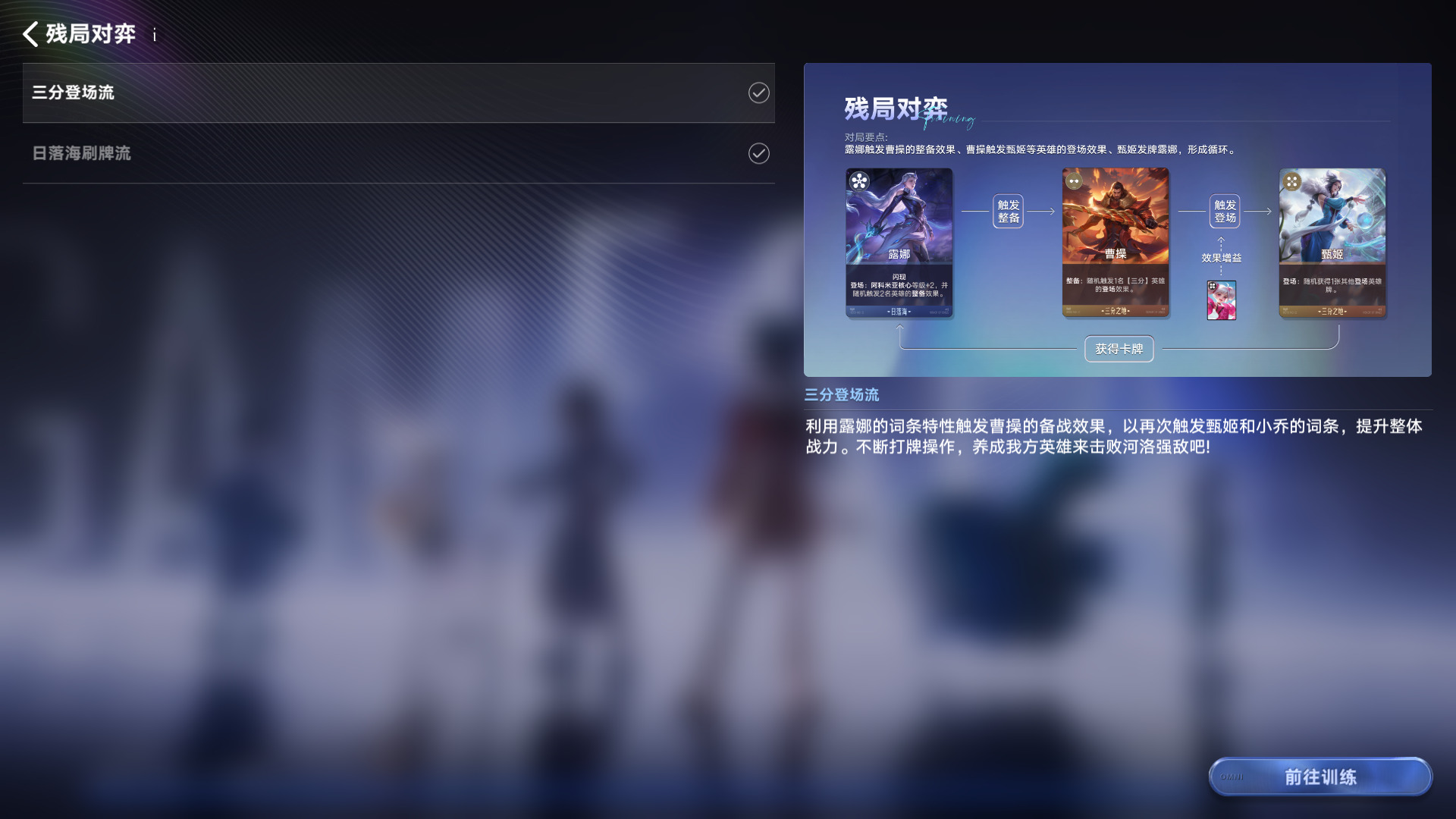在第二回合钱快花完,商店也刷不出什么好牌的时候,最后几轮5级效果牌要开始选能继承等级的牌(传承或遗志),为了第3回合集中等级给吕布或者露娜,甚至海月,都是可以的,只要等级集中,就稳过。