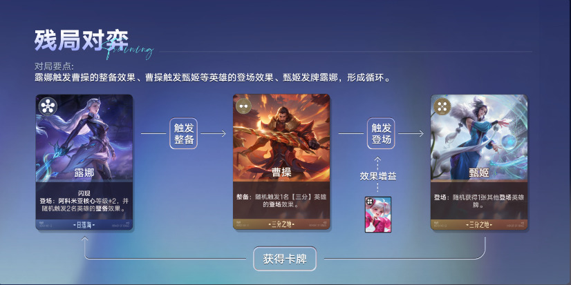 三分倒转的核心关键牌就是打出露娜,触发曹操的整备,曹操的整备触发觉醒甄姬的3选1,有概率再次选到露娜,形成循环。