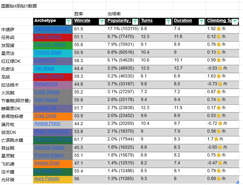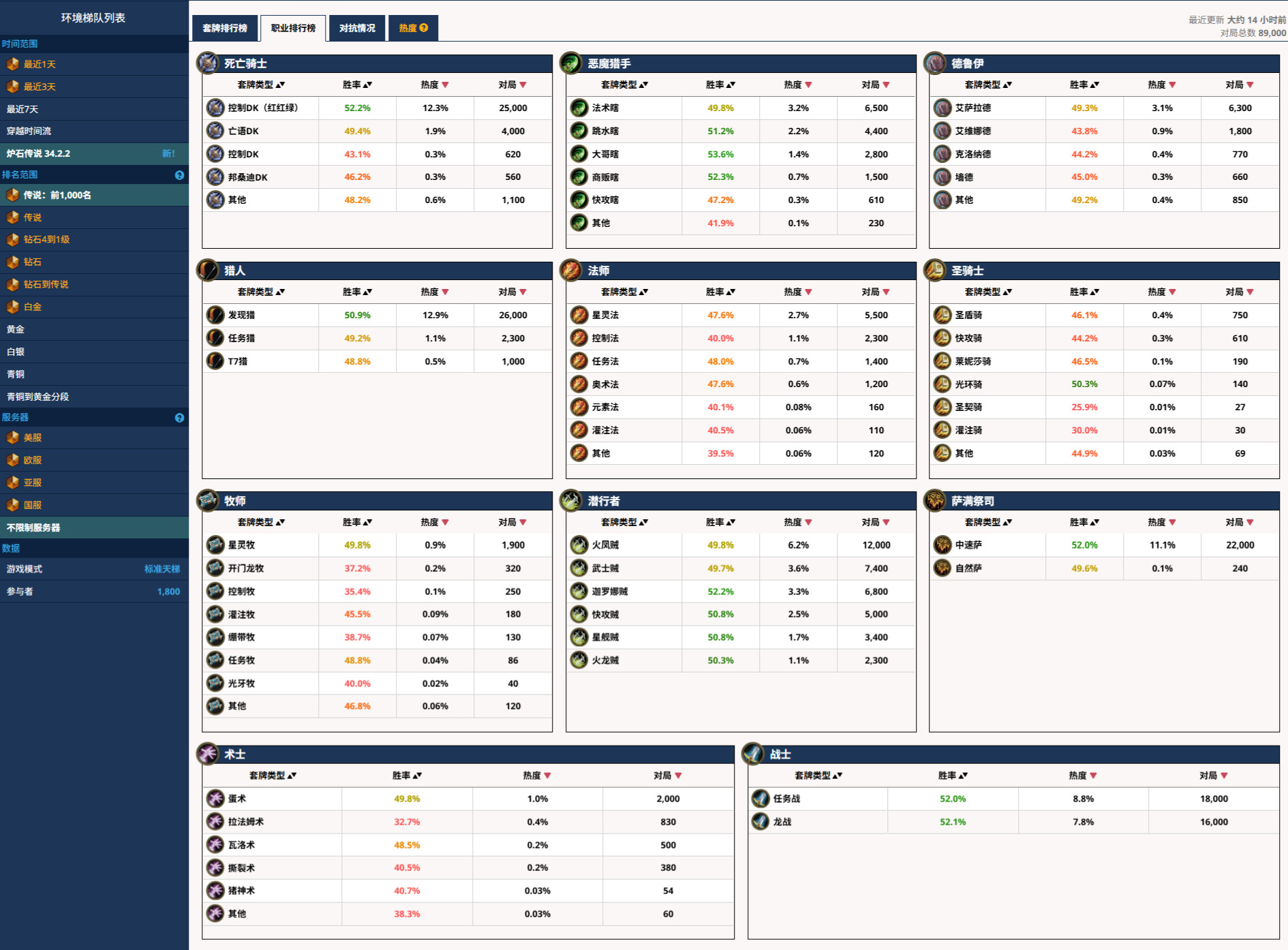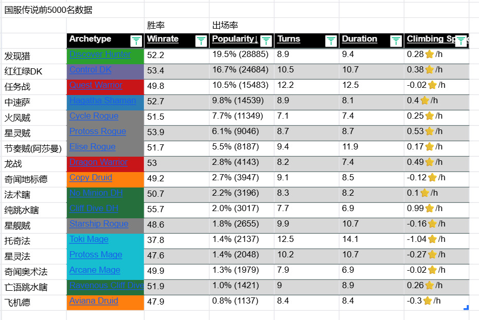 依序为: 发现猎/红红绿DK/节奏阿莎曼贼/任务战/中速萨/火凤贼/龙战/星灵贼/跳水瞎/奇闻地标德/星舰贼/法术瞎/星灵法/星灵牧/赫雷恩DK/蛋术/奇闻奥术法/精魂瞎/飞机德/托奇法/任务猎/其他贼