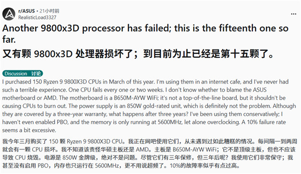 一两周就坏一颗9800X3D!网吧老板哭诉:甚至没超频