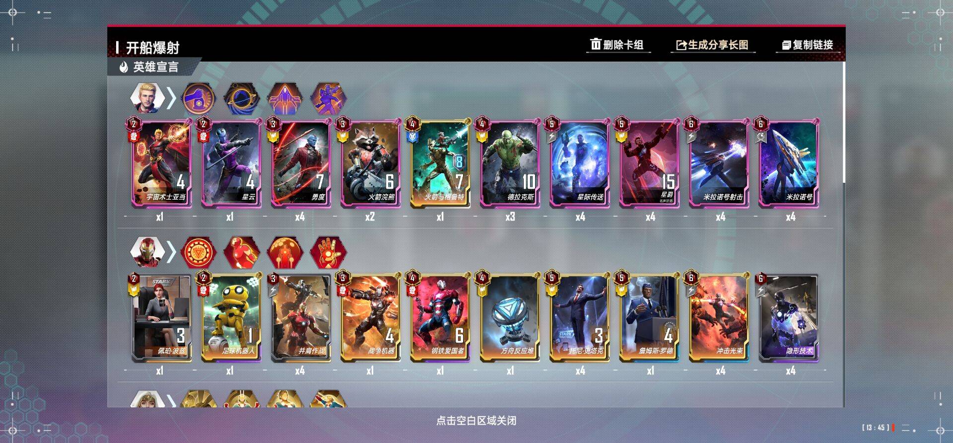 星爵:界传送和界星爵皆为大核心,作为同位素卡必须满上,条件允许的情况下可以造两个四星星爵作为最强战力支撑/界船,必须四张,核心遭遇,现在大多数卡组都有战斗内加战力的手段,终幕更是不讲道理直接K头,终结手段之一/界射击,高分段有多少带多少,在憋尿局发挥极佳,特别是进入三家混战的局面,都是健康血量的情况下打多张射击,下回合那家的经济就崩了,无缘决赛圈,二人对峙的时候更能在一回合无法结束游戏的情况下给对手极大的经济打击,下回合基本必赢,低端局如果不会用可换成跳舞等针对卡。