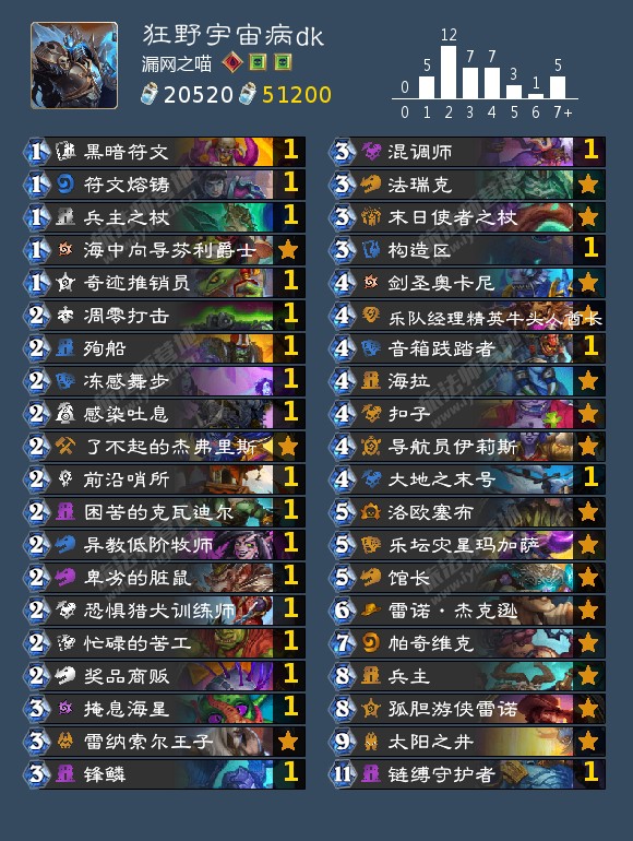 就先讲这么多,再次强调下,dk在狂野属于地沟油类别的卡组,可能一百把里面匹配不到一把,我遇到对面是dk也会认为对面是变装贼去留牌(