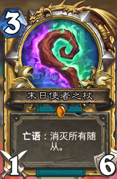 末日使者之杖,伟大无需多言,我得在这里给这张卡道个歉,因为预览的时候我并没有看好这张卡,在我帖子下面有小伙伴评论问我怎么看这张卡,我给出了很一般的评价,但是现在使用下来体验太好了,多一个灵活的群a对dk来讲太关键了,很感谢小碎骨的思路,通过法瑞克定向检索符文熔铸和黑暗符文,大幅度提高了这把刀的上手率和触发率,起手有刀的情况下根据对面职业也可考虑直接留下。