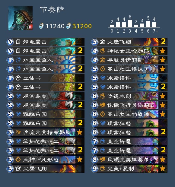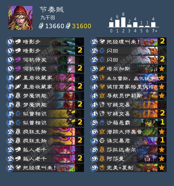 第一个是九千羽登顶的节奏贼,节奏贼现在几乎只有 5 和 6 的区别,5 是沙箱恶霸,6 是潜踪大师奥普,6 可以换成 4-2 的狂战斧,5 可以替换的东西就比较多了,除了沙箱以外,还有小丑、金胡子钩尾等牌,我自己是比较喜欢金胡子的,因为我环境里的 DK 有点多啊,金胡子在打长局的时候,还是比较有用的。