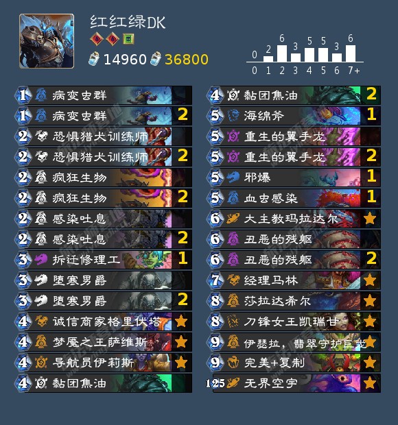 前期我们就下一些比较超模的怪,比如病变虫群、恐惧猎犬和凋零同化这些牌,然后到了中期,用业余傀儡师啊,buff 一下我们手上的牌,再打出蛛魔守卫和玩具盗窃恶鬼,来一波铺场,最后再用黑棘针线师和嚼嚼怪来收尾,基本上就这么个顺序啊。不过我在玩的时候碰到一把盗贼,我好不容易亏费下的傀儡师,然后养起来的嚼嚼怪,他直接一偷偷过去,然后复制加攻给我给踢死了,所以体验不是很好,高分段慎玩,高分段慎玩。