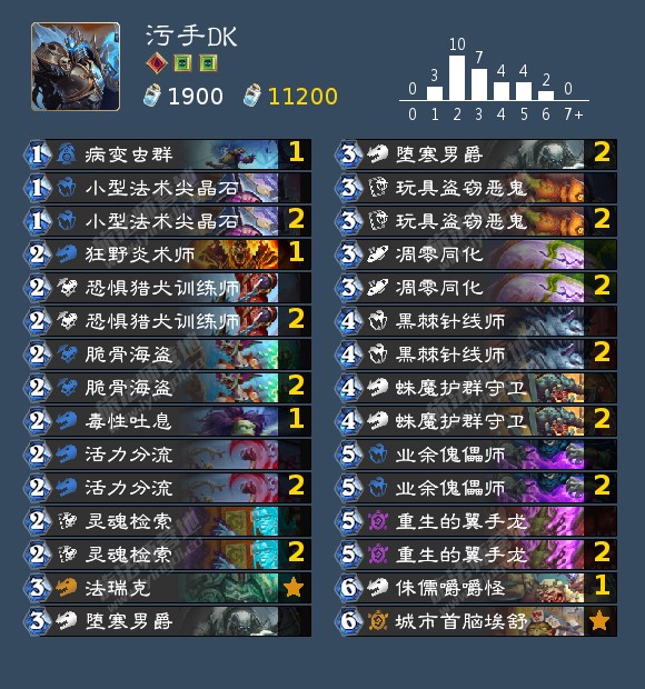 下一套是污手 DK,现在污手 DK 的强度,在脆骨海盗砍了一刀之后,其实强度是有所下降的。这一套的核心是,用业余傀儡师来 buff 我们手上的玩具盗窃恶鬼、蛛魔护群守卫和黑脊针线师,还有侏儒嚼嚼怪。