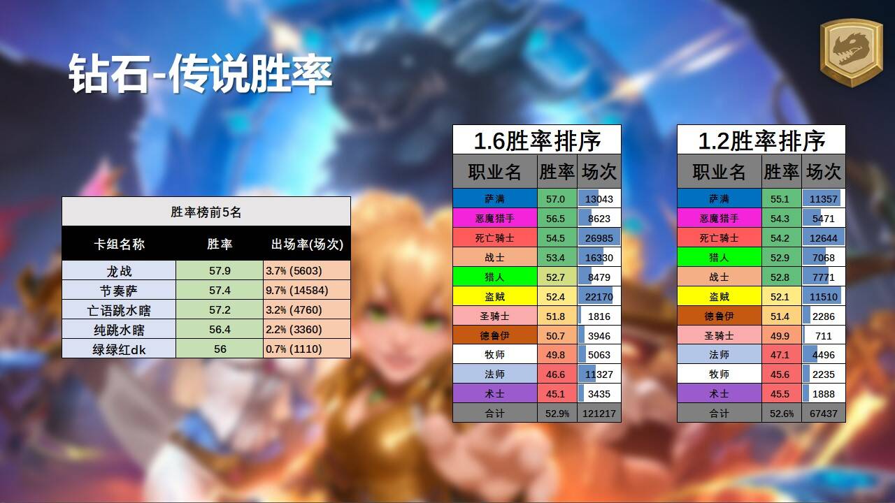 胜率方面变动不大,还是萨满第一,低分段的王者萨满。第二是恶魔猎手,我们前几天推的亡语跳水虾和纯跳水虾,现在的表现都非常不错,大家都可以去玩。亡语跳水瞎在对阵萨满的时候,优势会更大一点,纯跳水瞎在对阵贼和 DK 的时候,优势会更大一点,大家可以根据环境去选择卡组,这卡组上期视频都介绍过,大家文档里往下翻一下就能找到。
