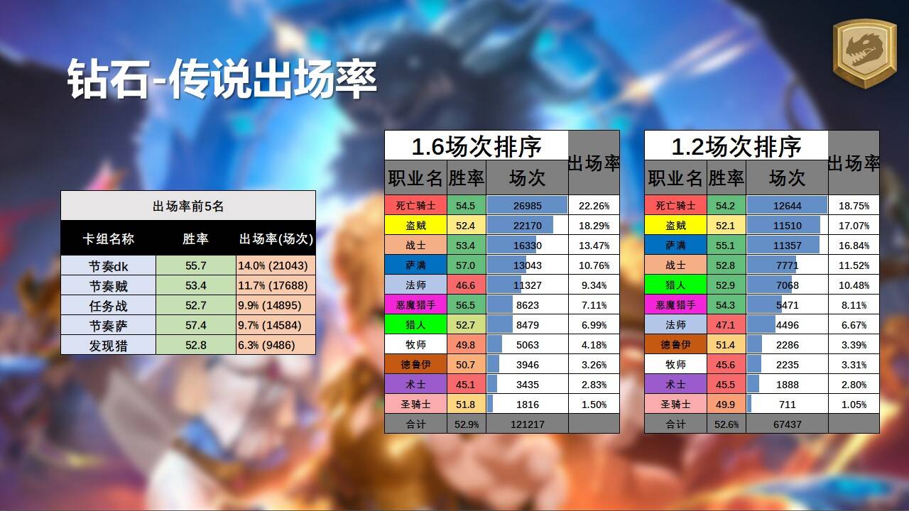 出场率方面,DK 的出场率上涨了 3% 左右,盗贼也是因为最近频繁登顶,出场率也上涨了一些,其他职业的出场率都降低了非常多。