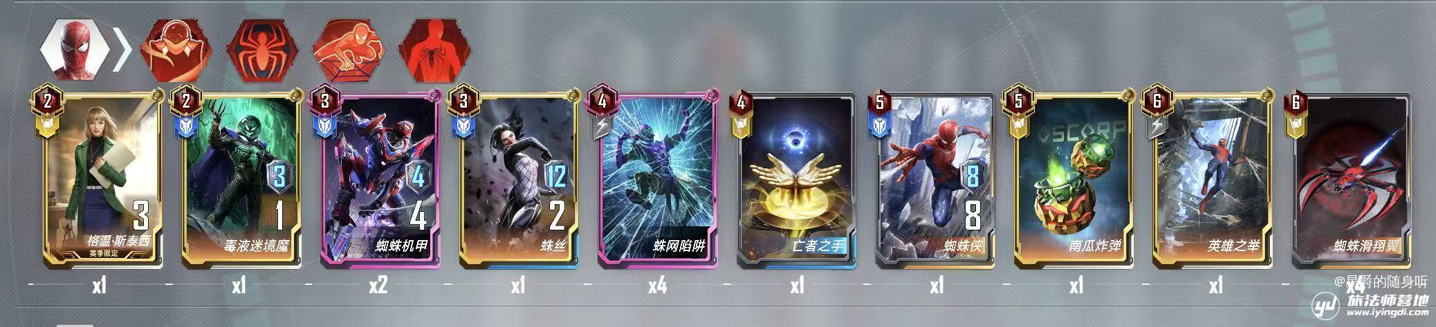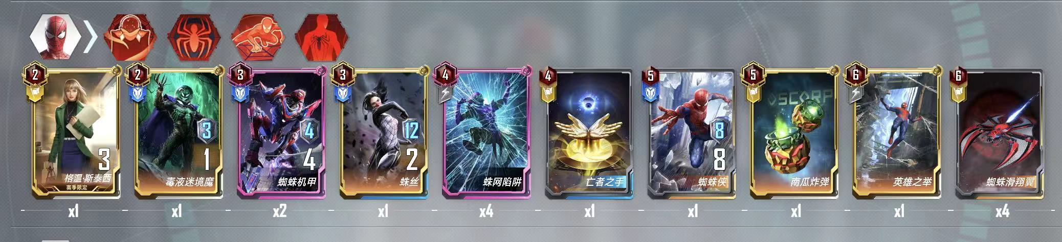 3费蜘蛛机甲带2张用于前期叠赏金,战力不俗,不带蛛丝喷射主要是前期容易卡手,后期其实先手问题可以靠滑翔翼解决,就带蛛丝
