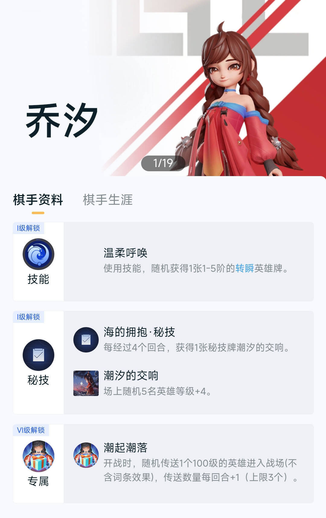棋手只能选择乔兮,核心思路就是尽量少扣血,快速提升棋手等级到满级,满级后会有随机的100级英雄入场,能大幅减轻场上的压力,在升级的过程中,利用温柔呼唤召唤英雄上场,场上满员后,有河洛英雄就可以替换掉场上其他阵营的英雄。棋手满级的潮起潮落,每回合会增加一个100级英雄,一共3个,就是300的临时等级,这点和司空震的英雄特性可以形成配合,形成超强的战斗力。