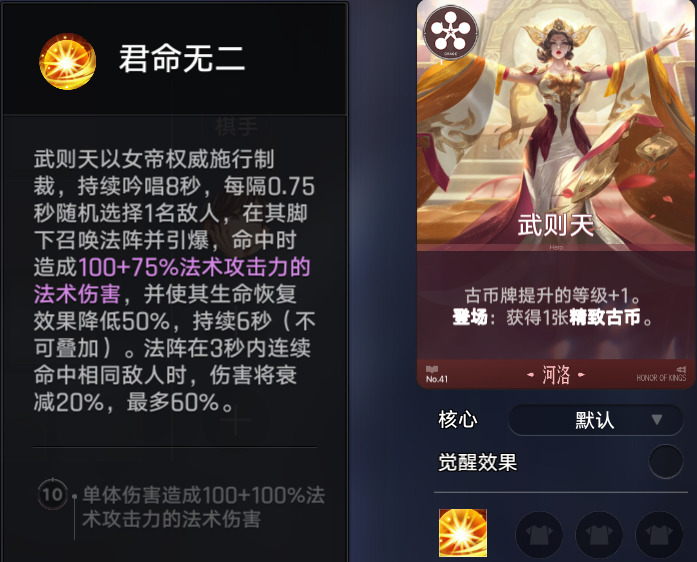 武则天不仅能让古币牌提升的等级增加,还能获得1张精致古币,除此以外,她的技能效果可以降低对手的生命恢复,能极大的克制对手的生命恢复机制。