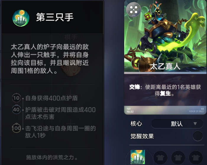 太乙真人可以使距离最近的1名英雄获得复生,极大的增强了单C司空震的容错性,被秒一次还有翻盘的机会。