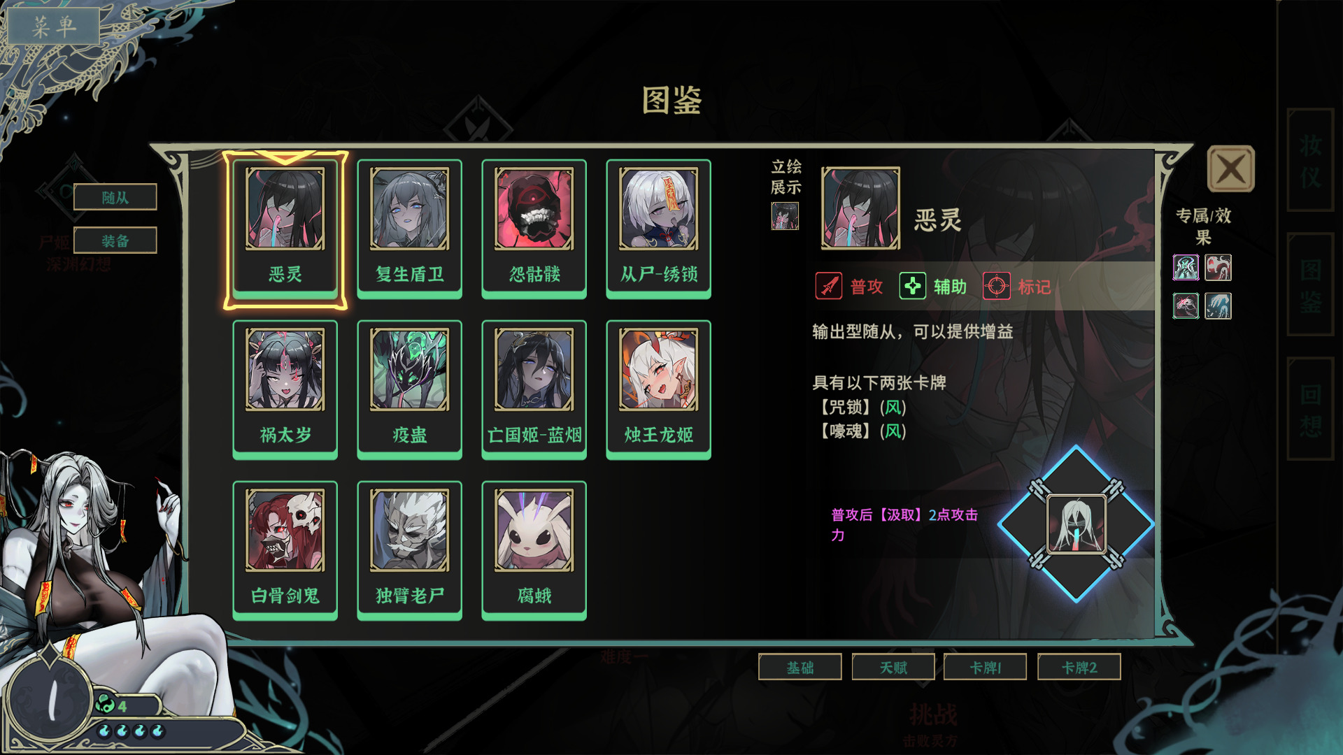 比如恶灵,定位是普攻+辅助+标记,基础天赋是普攻后吸取敌人2点攻击力,这个技能让她在前期能快速积累优势,通过不断吸取攻击力提升自身战力。她的天赋进阶有两个方向:一个是攻击力提高20%,普攻吸取5点攻击力,偏向纯输出强化,适合成为主C;另一个是任意带有标记的敌人被攻击后,吸取2点攻击力,偏向辅助团队,适合多随从协同作战的构筑。