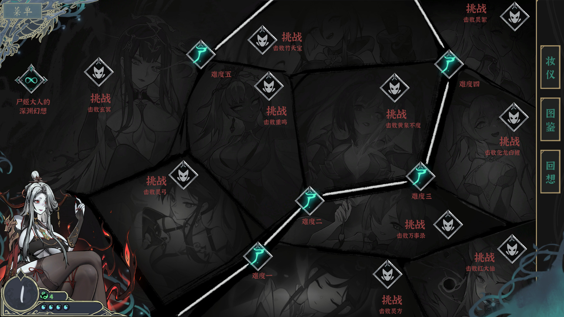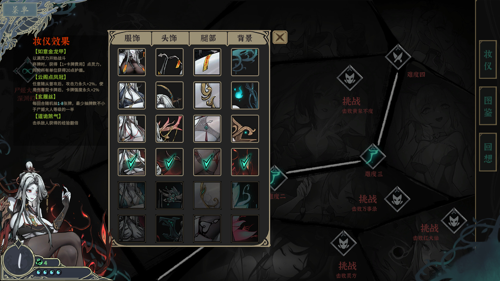 《尸姬之梦》的养成系统不算复杂,游戏主界面右侧的妆仪、图签和回想三大模块,每个模块都很重要,其中妆仪系统更是影响战斗走向的关键。