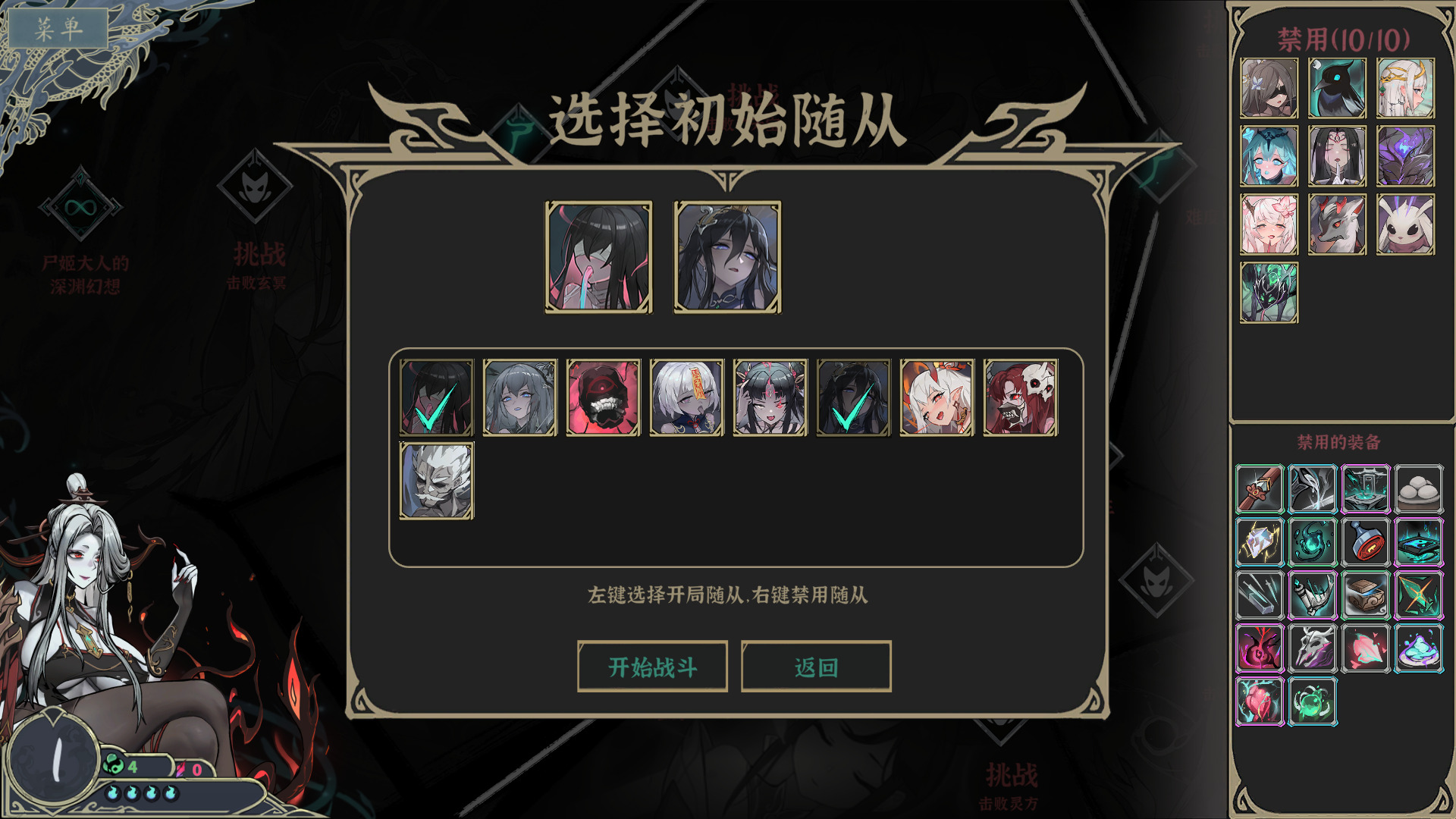 除了以上举例的随从,游戏里的其他24位随从也各有特色,比如疫蛊的玩毒流派,烛王龙姬的法术爆发、三目上人和剑奴的飞剑玩法、独臂老尸的真伤能力等,每一位都能撑起一套专属构筑。而且游戏还有一个很人性化的设定:每局游戏开始时,玩家可以选择2个随从开局,还能禁用2名随从(随着解锁随从数量提升,最多可禁用10名),被禁用的随从及其专属装备也会一同禁用。这个设定能让玩家针对性地规避阵容不适配的随从,快速刷到自己需要的装备。