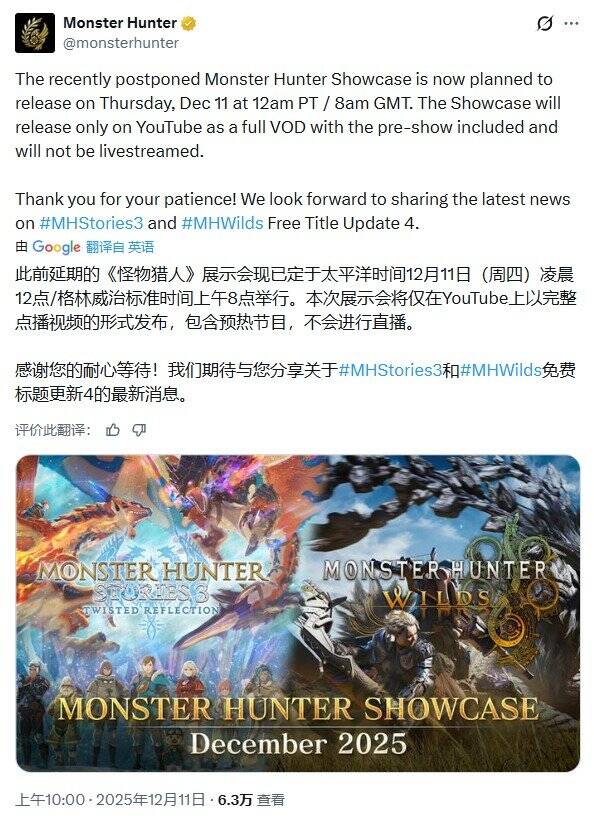 官方表示,本次节目将包含预热环节与正片,重点发布《怪物猎人物语3》与《怪物猎人:荒野》的免费第四次大型更新等系列作品的最新情报。