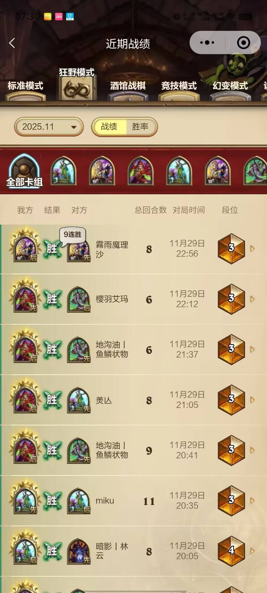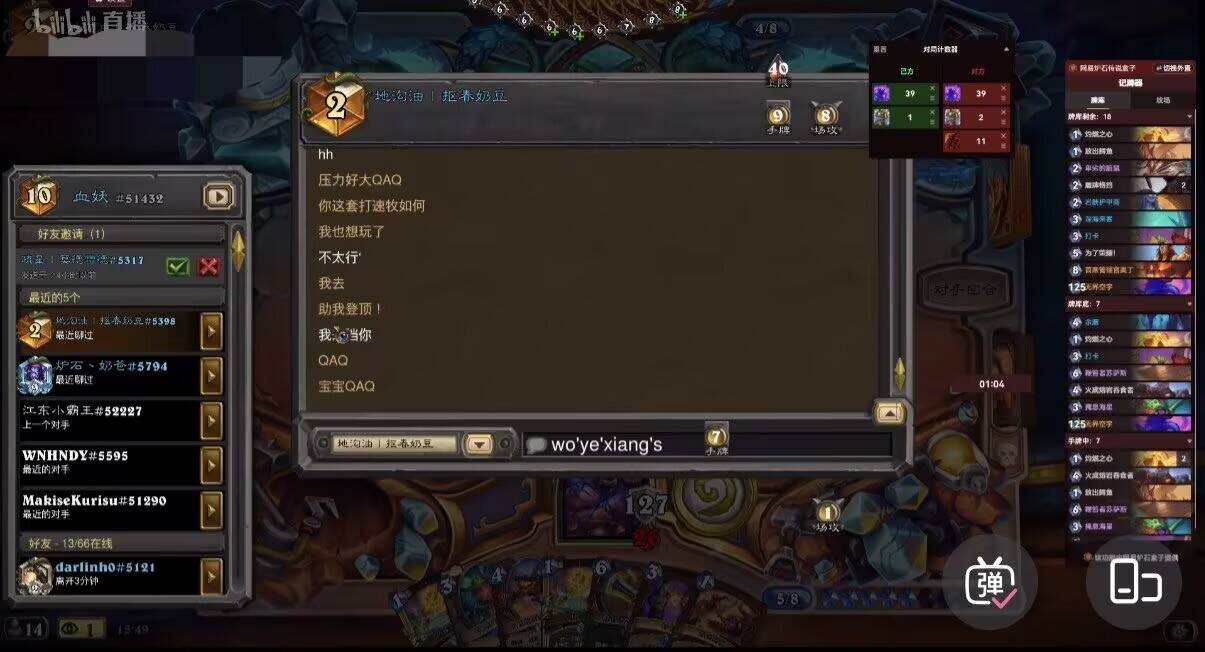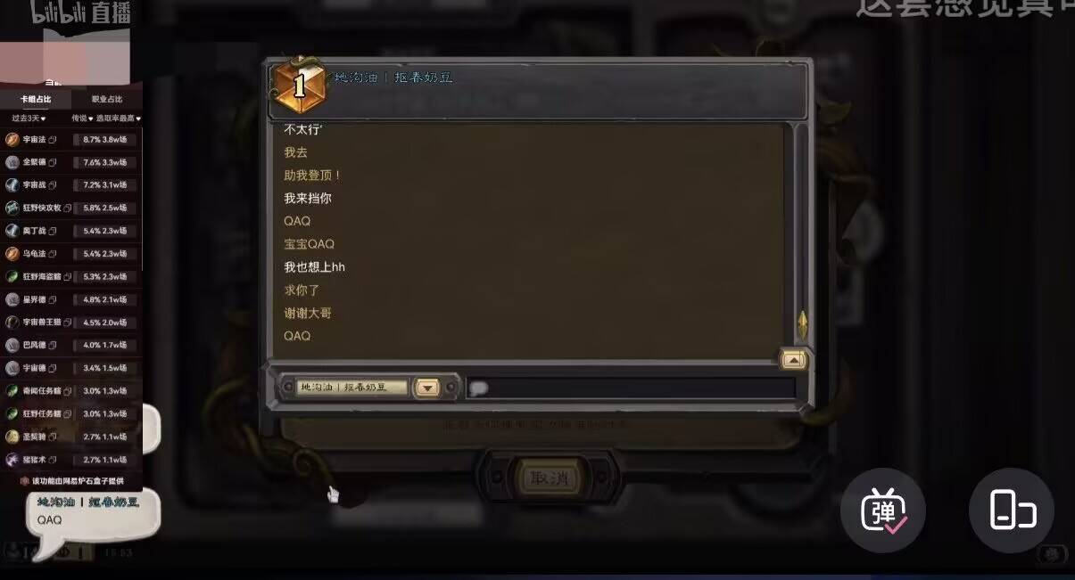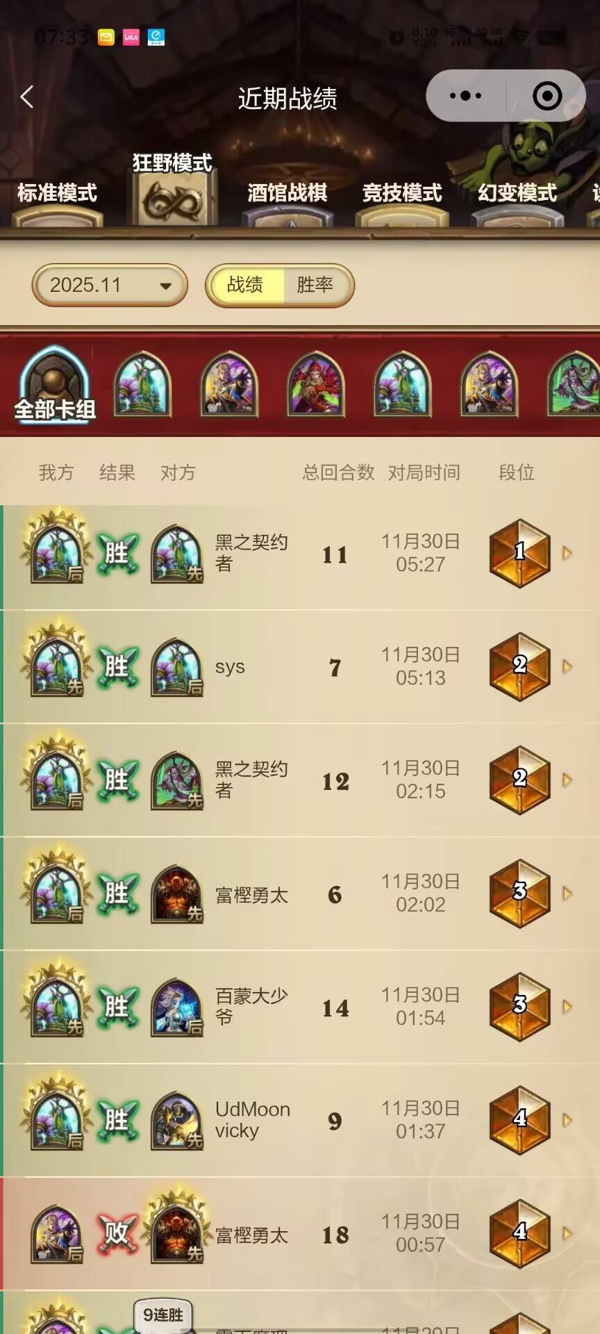 地沟油战队的高手,也就是11月月结登顶的强者,地沟油丨无情小包。根据其b站账号“笨比面包”在动态发布的登顶战绩一页有三分之一都是地沟油战队的成员或者是与其小团体有关的玩家。其中有一把对局相当醒目,因为对手既不是地沟油战队的,也不是小团体的,该对局对战回合数是7。对手id为sys,常年玩宇宙德的一位玩家。也就是说这场对局无情小包使用30全聚德先4斩杀了对手40德鲁伊,这个概率是相当低且几乎不可能的,你们也可以去抄一下无情小包的构筑尝试,看看有多少局是先4斩杀的,这还不包括宇宙德没有使用干扰牌的情况下。在这个条件下完成先4斩杀只有两种可能,要么买下了或者py了这场对局的胜利,要么是sys手牌太劣势直接投降;而熟悉全聚德这个对局的玩家应该知道,对阵全聚德完全没必要因为手牌劣势投降,因为宇宙德携带了一部分干扰牌,没必要看到全聚德跳了两个水晶就吓到投降。