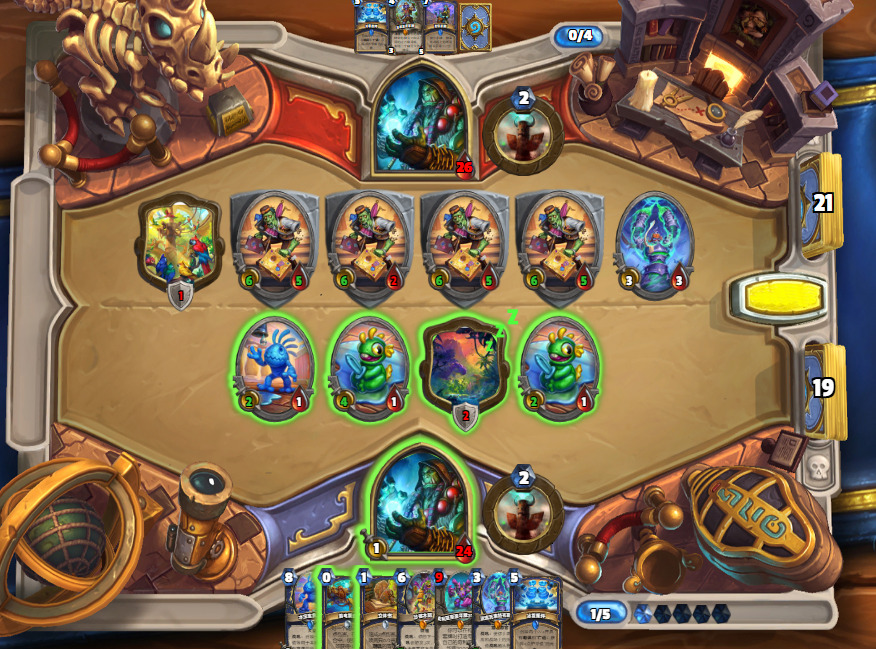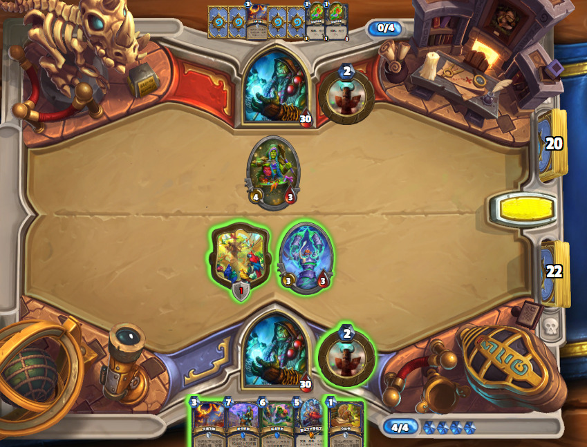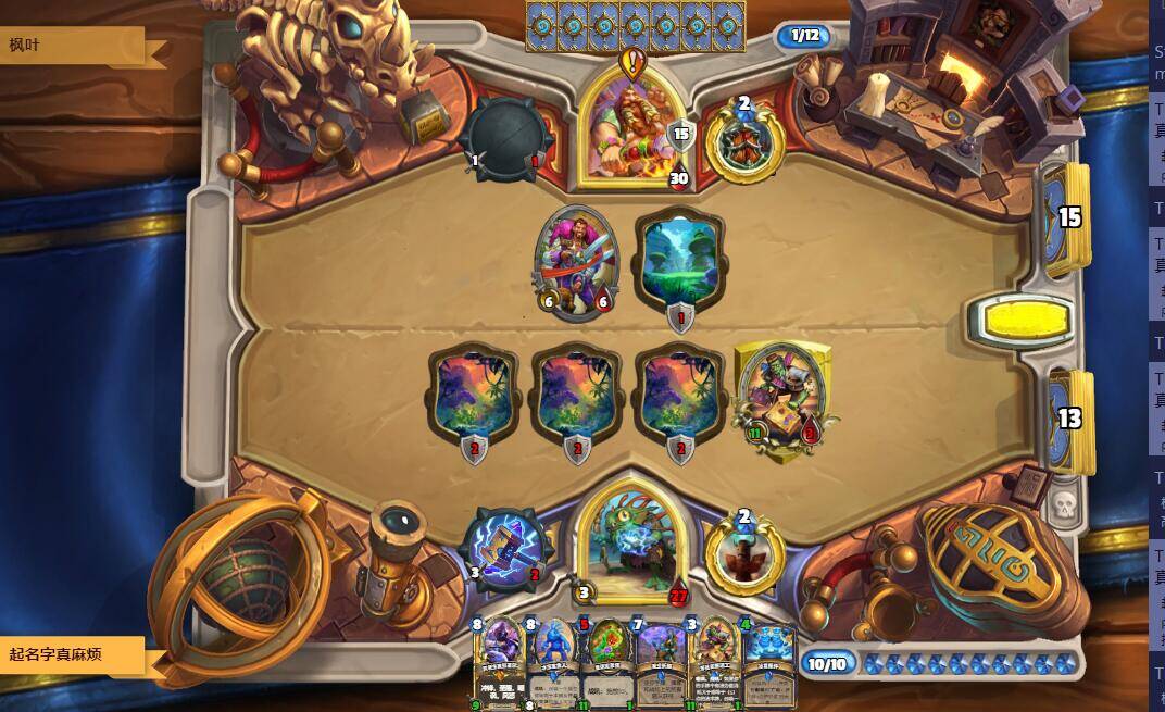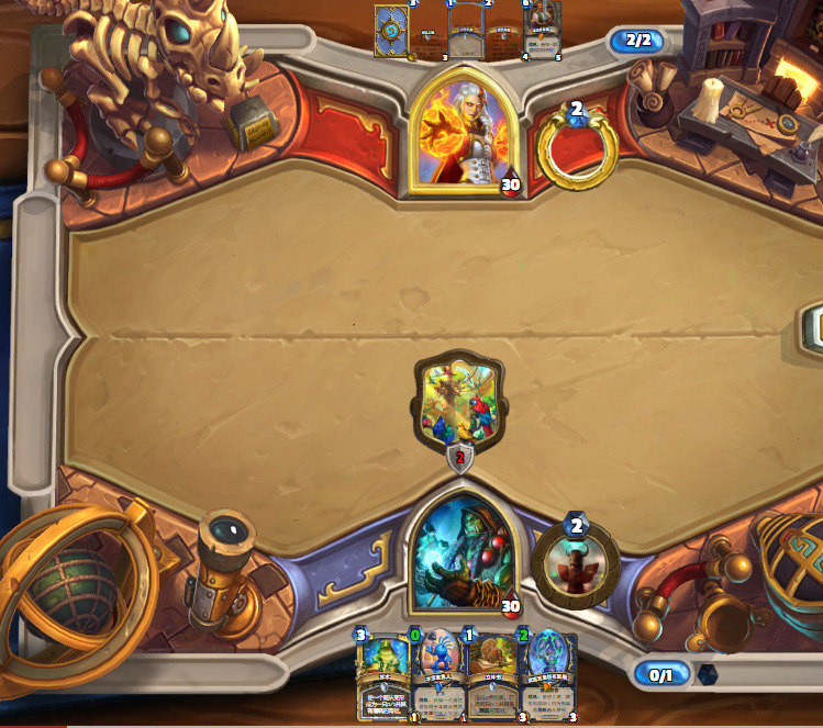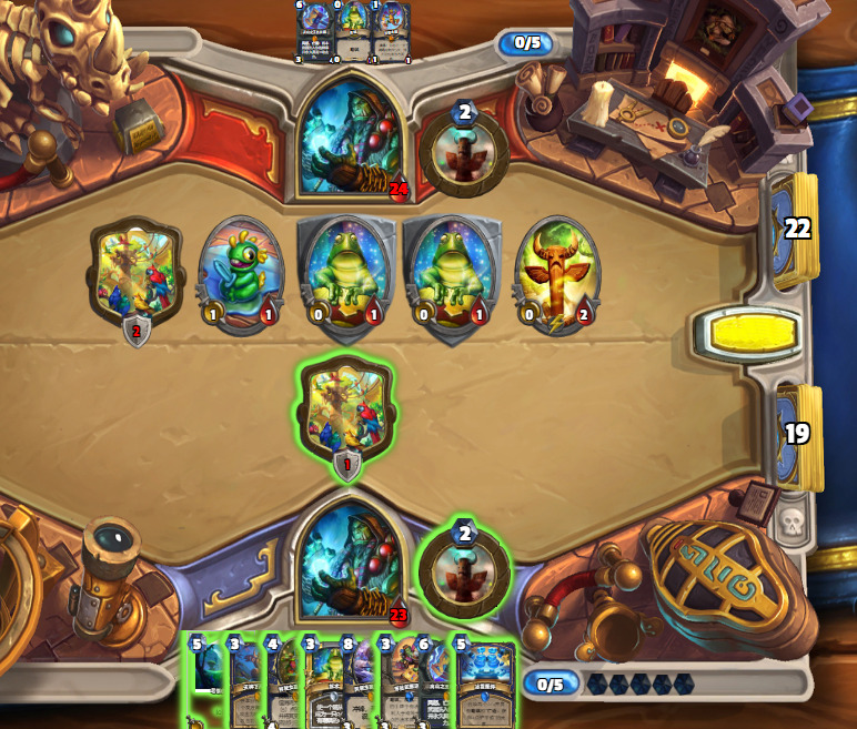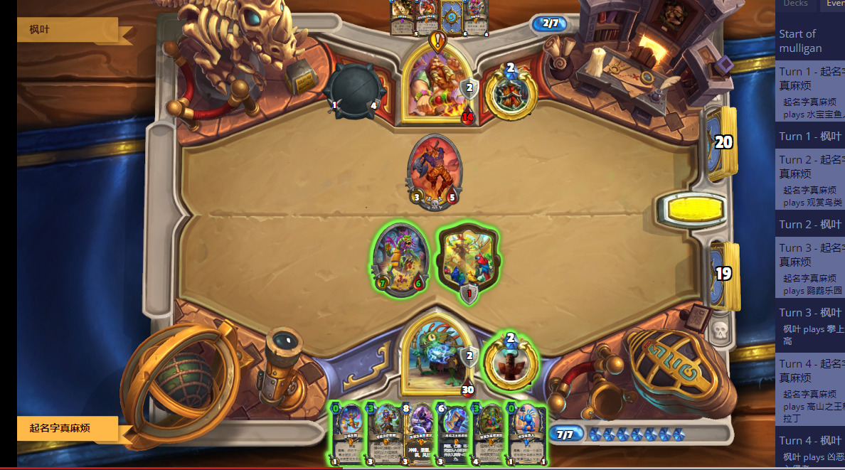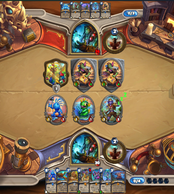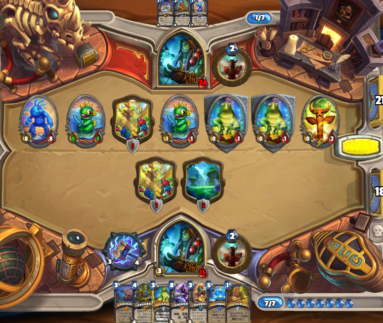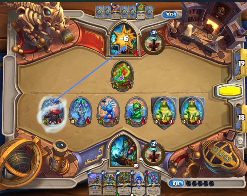这把起手比较爆炸,2费图腾,3费火鹰过到的两张也没有提供很大的场面优势,但对手4费拍下的焦油被呱掉了,堪堪维持住了场面。