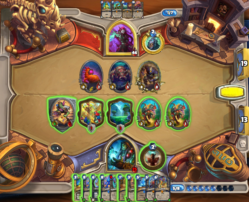 这里,看上去前期攻势比较顺利,但战士提上了蛋盾不可能抢死,这些血量都是分分钟奇利亚斯回满的事,而且抽过了大餐不缺牌(有马林可以马上补大量资源)。已经到7费回合了,对局被拖入了中后期,回合数非常有限。在有可能哈加莎三倍祈愿的情况下,我没有选择稳定三倍哈加莎+三倍祈愿。而是选择捏三个一费标,确保攻势和回合数的情况下用一费的迅猛龙蹭蛋盾、配合三倍祈愿,以及奥拉基斩杀。