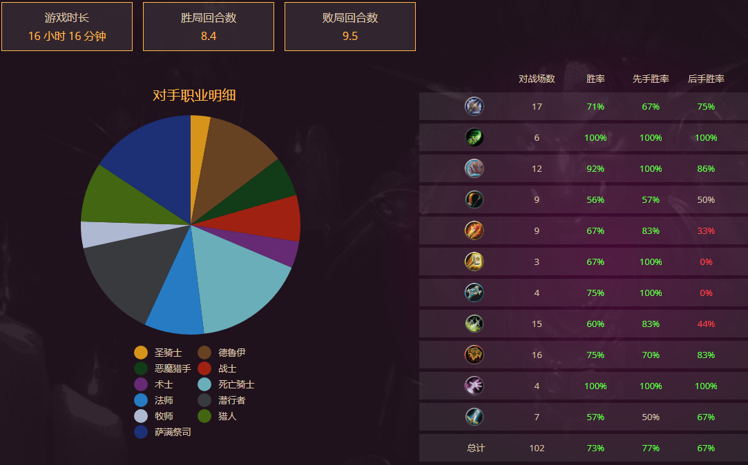 这赛季沉迷中速萨这种高效卡组。在国服68%胜率打到第7后,虽然对贼和发现猎的胜率依然高于70%,但还是深感对上高手火凤贼和发现猎的无力。于是上美服,从传说开打,73%胜率登顶。