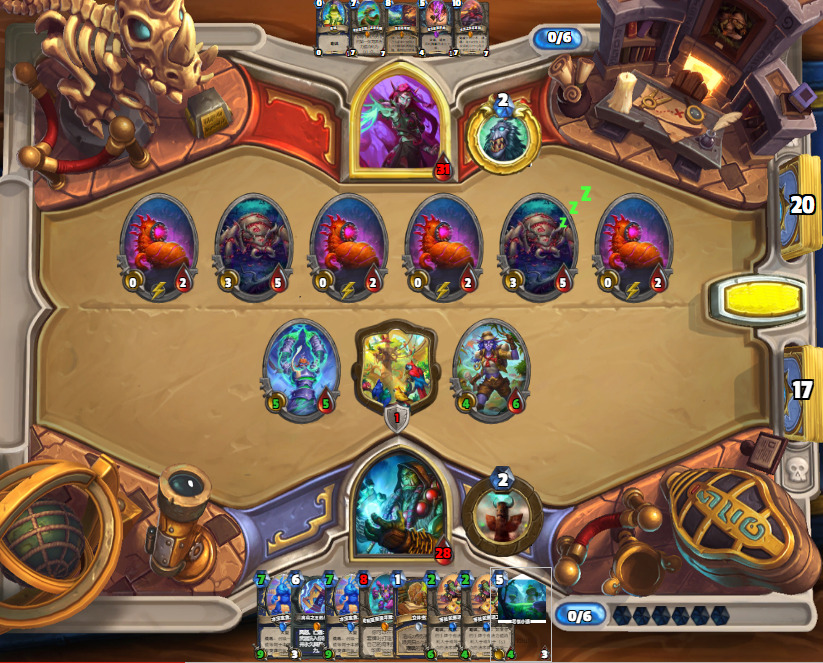 一个全看对手胡不胡的对局,你能做的只有抓住所有的机会最大化场面,上高攻怪蹭对面的血,小鱼人和法术做一下适量的场面交换,有机会能在墙背后保一个风怒奇闻赌对面可疑交易刺歪是非常好的机会。