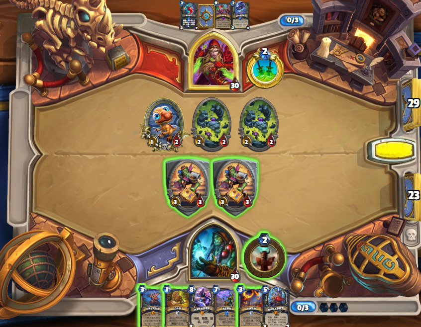 2回合之后。这两回合内我捏了3个1费标,2迅猛龙2复制,1加攻找法术。润滑费用的同时打出三倍祈愿,持续给压力解场站怪。但是对面也解光了场面回满了血下了地标还叠了15甲,还找到了双攀和过满了手牌,下回合任务做完,脸上还有被我破到1耐的蛋盾。可惜这个是逃不出三倍奥拉基斩杀线的,加上场上的大屁股怪,斩杀线大概是48点左右,因此这回合完成了斩杀。没有让战士拖到任务做完的回合。