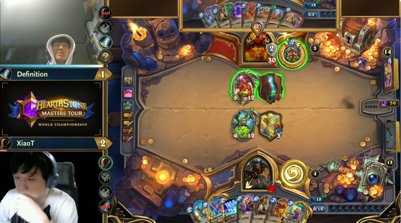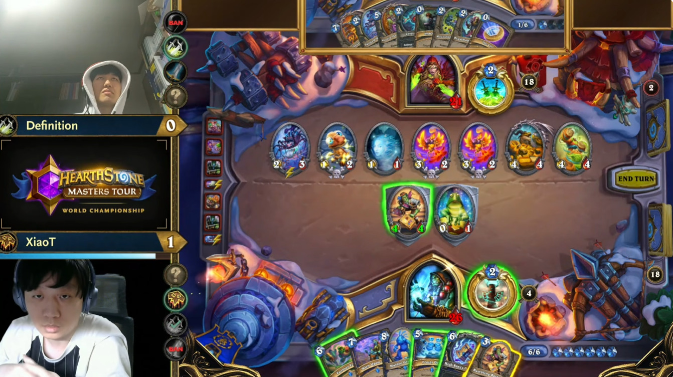 小惕的观赏鸟类没有找到笨拙的搬运工,改为跳币高山之王穆拉丁,而Defnition过牌数量足够,也没有被萨满蹭到太多血。五费Definition过到可疑交易,为下回合启动做好了准备,而小惕此时终于也抽到了能用于进攻的搬运工。