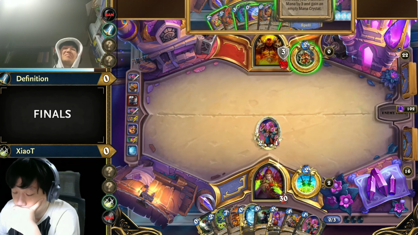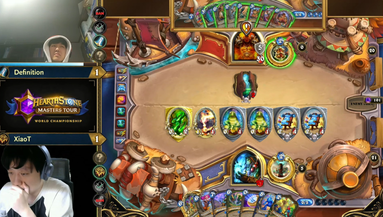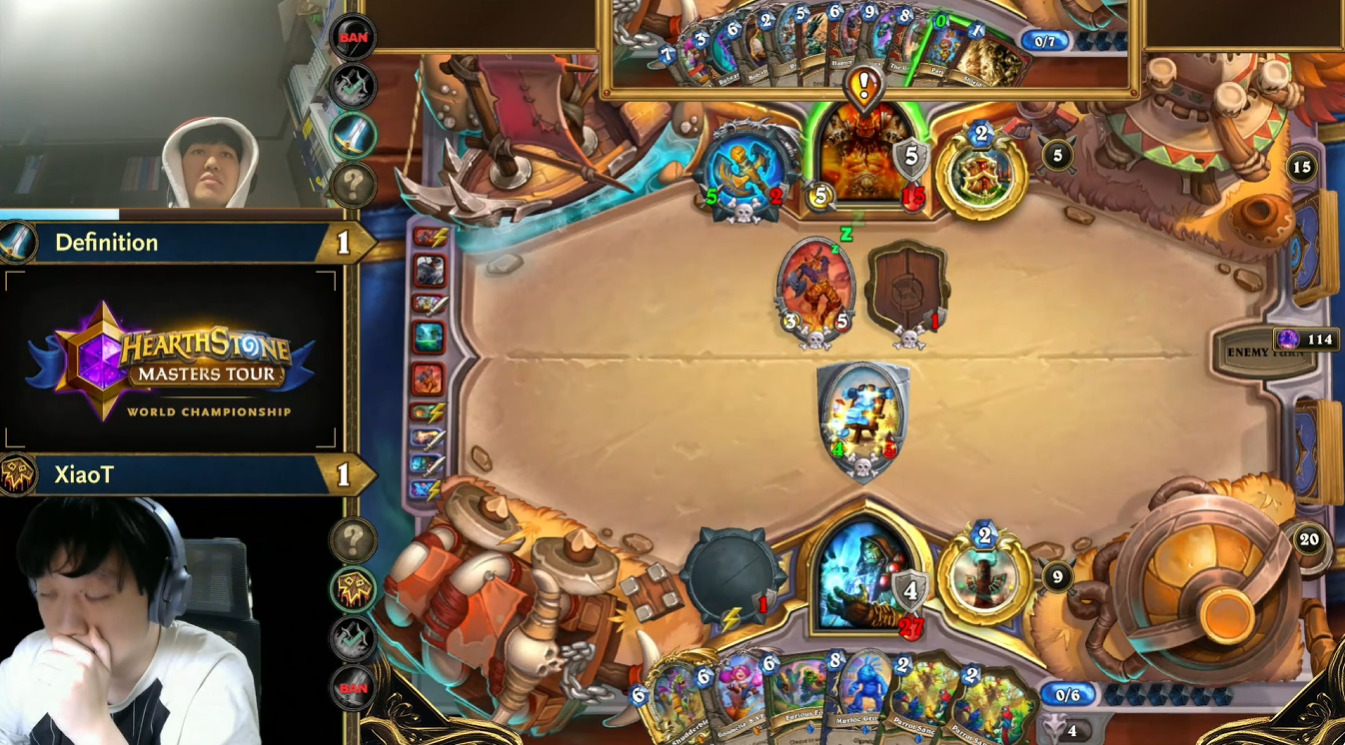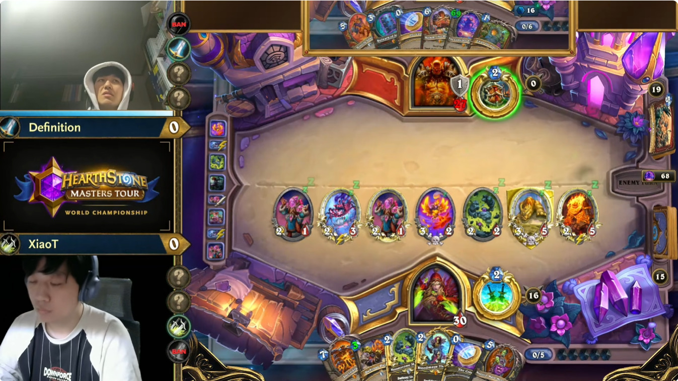 LoveStorm仍牢牢占据节奏优势,尤其是一件不留中有一张坚定的复仇者,这张卡最终逼迫Definition将随从全数进行随从交换后不得不用可疑交易消灭。几轮随从交换下来,LoveStorm仍是先手到达七费,虽然此时Definition反手铺了一波场,但LoveStorm长考后打出精彩一手,没有打伊辛迪奥斯,而是直接过空牌库,用牌库里的小行星将Definition的场面砸了个七七八八,并提起棱晶獠牙保证下回合一定能用伊辛迪奥斯的爆发完成斩杀。