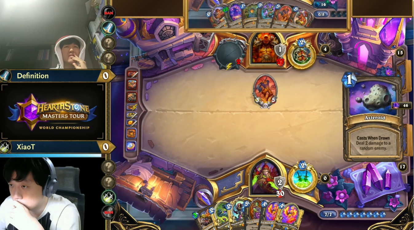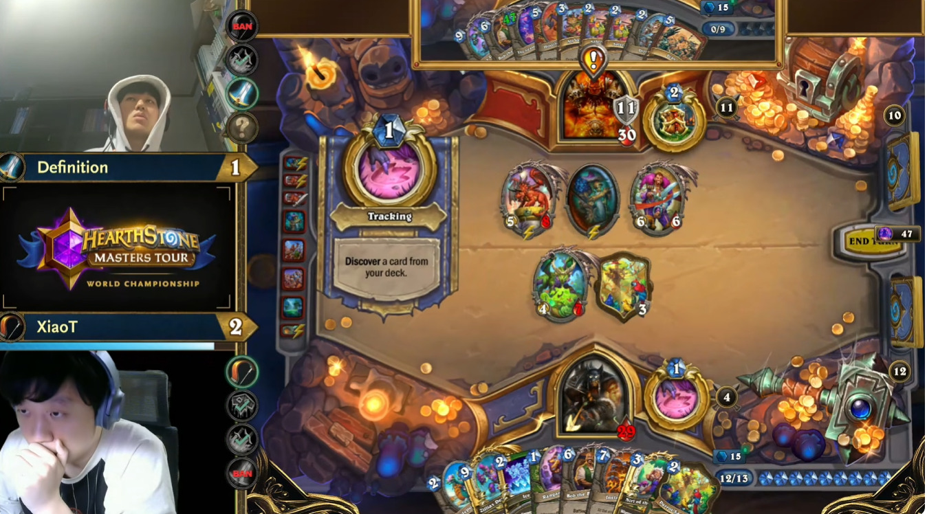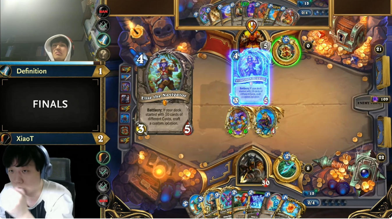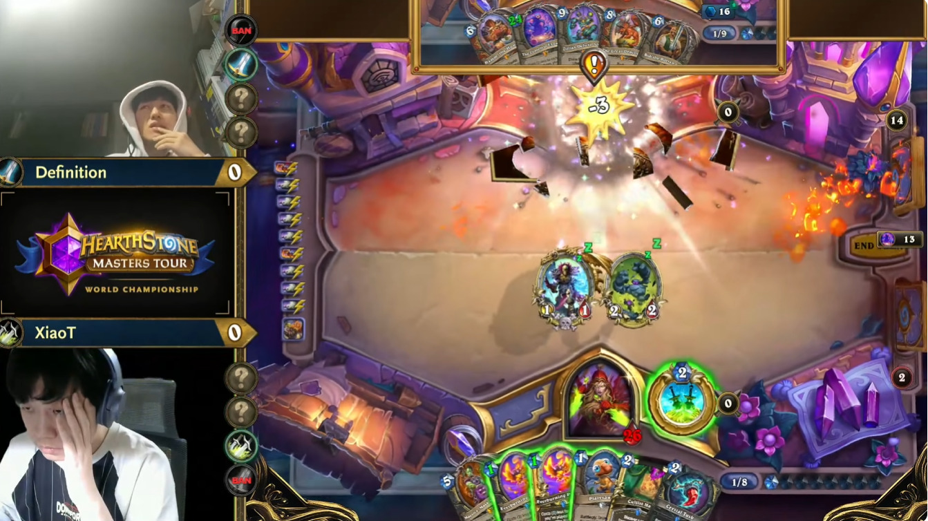 LoveStorm仍牢牢占据节奏优势,尤其是一件不留中有一张坚定的复仇者,这张卡最终逼迫Definition将随从全数进行随从交换后不得不用可疑交易消灭。几轮随从交换下来,LoveStorm仍是先手到达七费,虽然此时Definition反手铺了一波场,但LoveStorm长考后打出精彩一手,没有打伊辛迪奥斯,而是直接过空牌库,用牌库里的小行星将Definition的场面砸了个七七八八,并提起棱晶獠牙保证下回合一定能用伊辛迪奥斯的爆发完成斩杀。