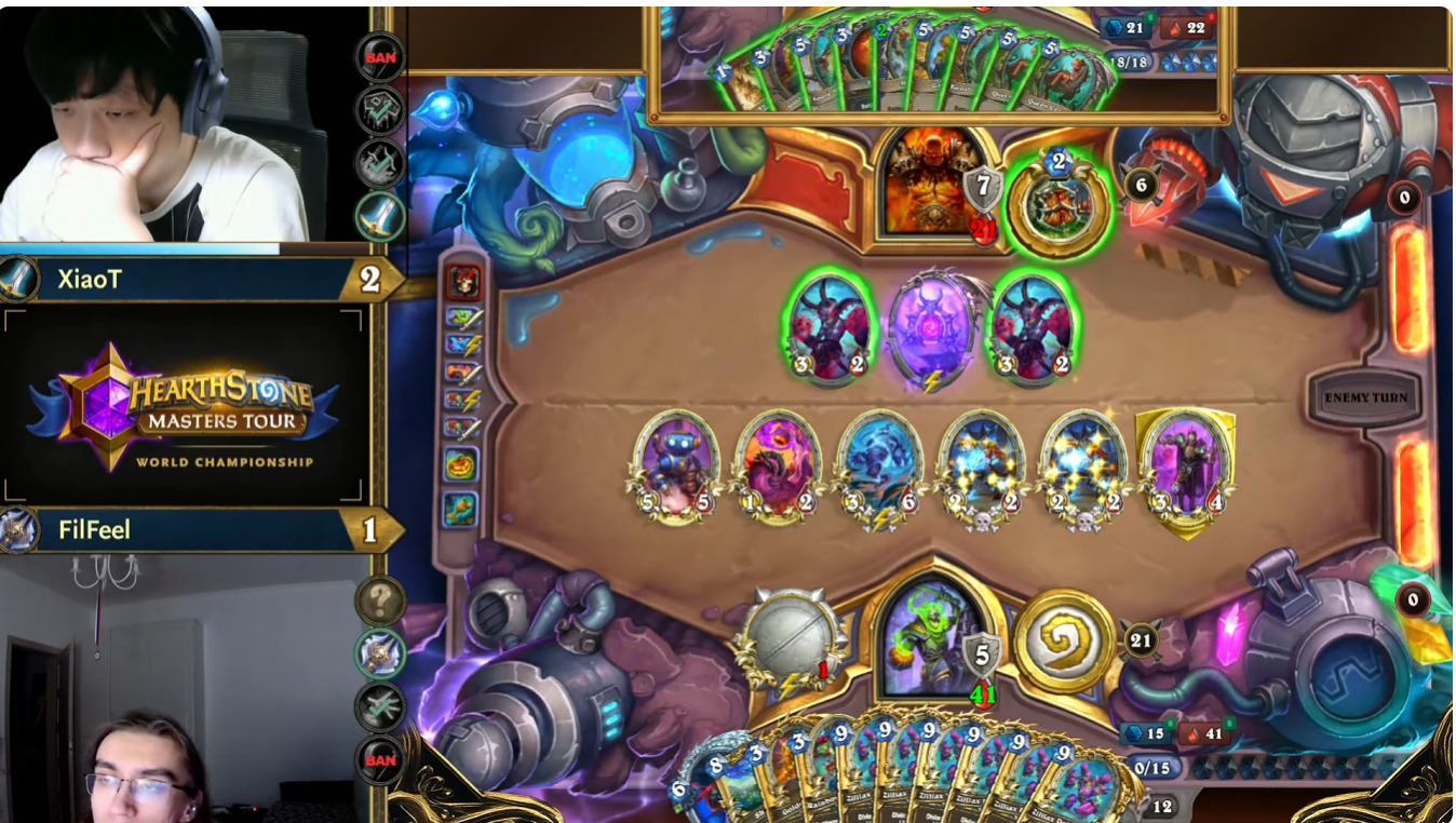 但是小惕只能一昧防守,没有攀上新高的他实在是打不出自己的节奏,不得不一直在防守资源中取舍。对局中期,FilFeel过到了海绵斧,但他当回合没提,之前鲍勃过到了三张黏团焦油让他觉得必须要靠黏团焦油控场,但这反而让小惕的血线压力得到一定的缓和。从对局最后来看,他选择全力防守的策略似乎问题很大,如果他能早点选择提刀全力进攻,或许对局不会被拖到如此的山穷水尽。
