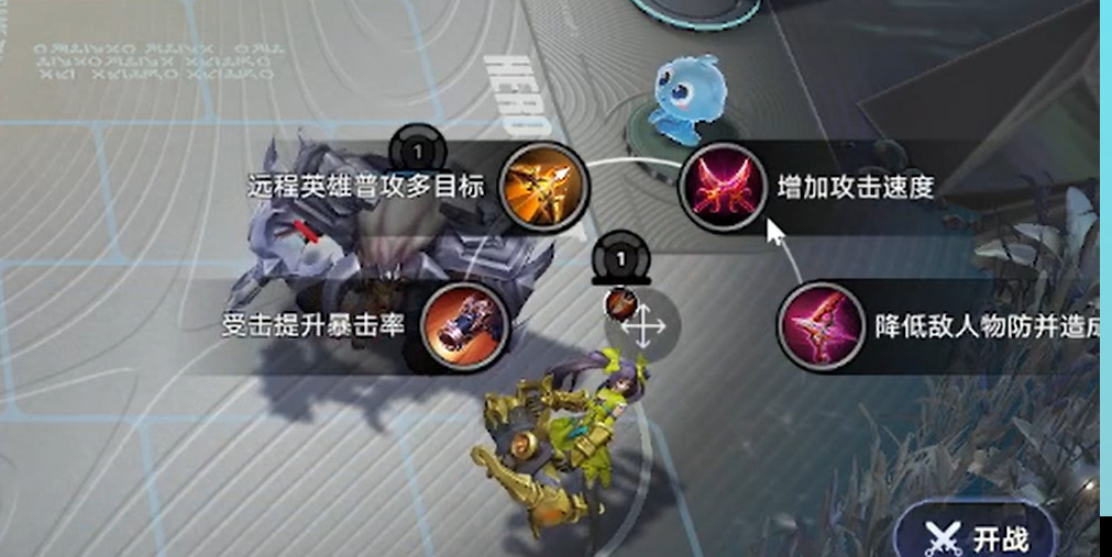 可以看到每个装备都可以从四个中任选一个升级,这里我们选择增加攻击速度贴附于孙尚香,因为孙尚香初始1.1每秒一次的高额攻速,配合这件增加50%攻速的装备前期作战能力较强,意图就是能战斗胜利吃到牛魔经济。