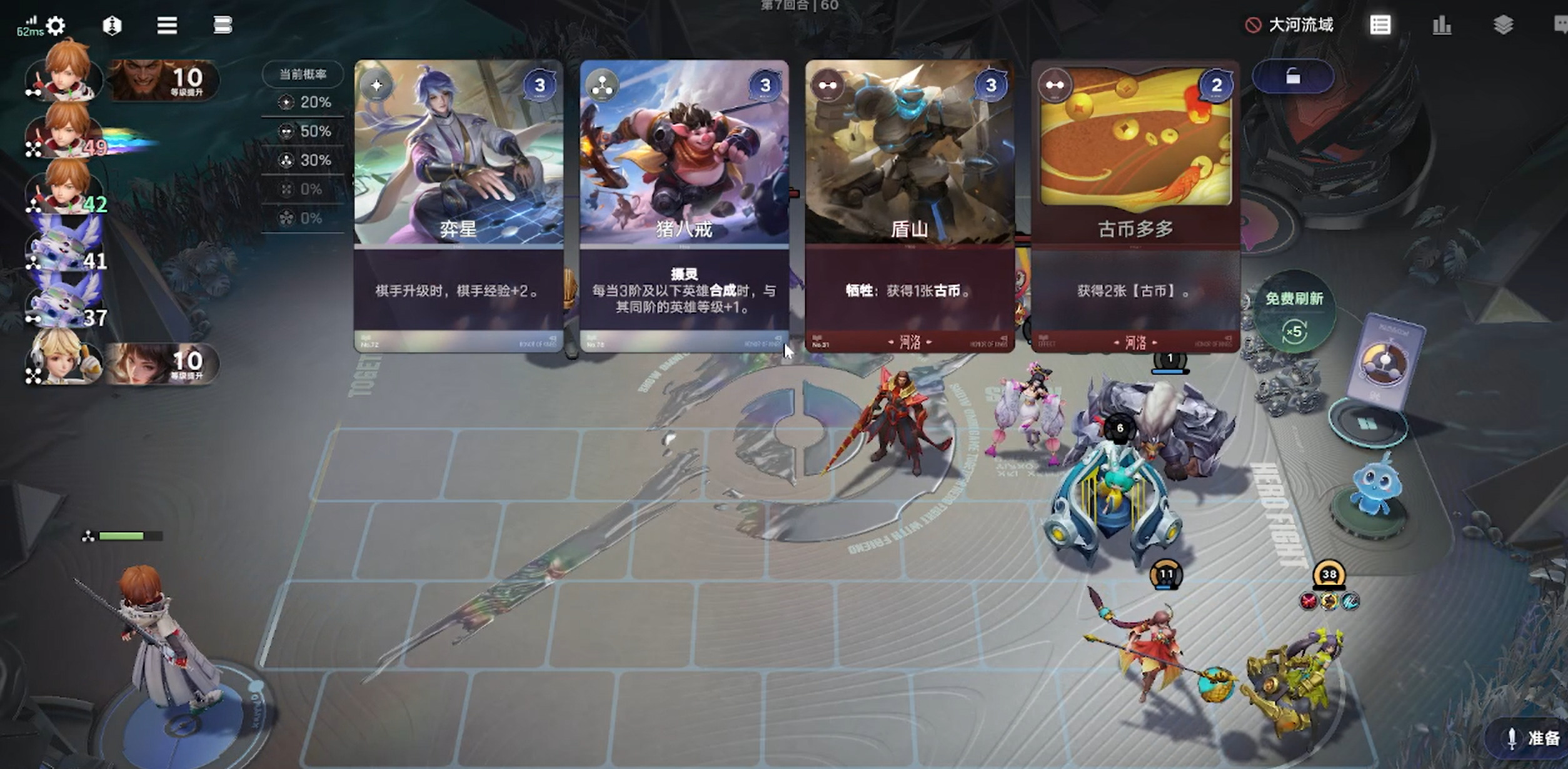 来到了第七回合,我们成功找到了猪八戒,它的效果是摄灵(登场会吸取附近相邻一个棋子10级)以及合成时相同阶的棋子都加等级,这意味着我们有4张2费三分牌,每打出一张都能额外获得4等级,再配合我们的白歌英雄,效果是获得场上棋子的复制,便可以最大程度的发挥猪八戒效果提升等级。