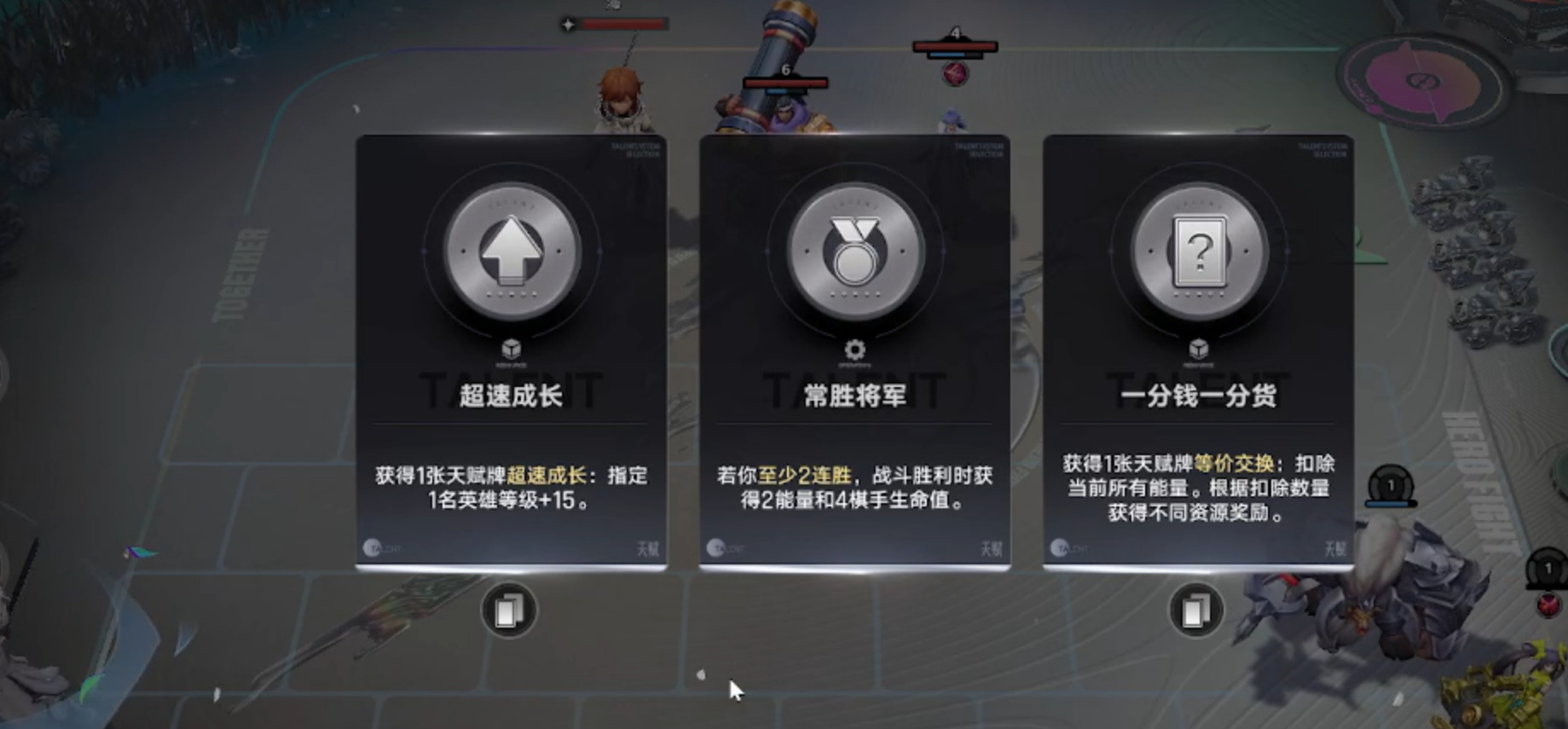 我们看到第一张是提升一名棋子15级,在这款游戏中,战力的衡量指标就是等级,每提升一级会有基础属性10%的加成,提升15级战力加成是比较可观的。第二个天赋牌是战斗胜利给经济和回复生命值,但一般来说我们没有连胜的把握,很容易浪费效果,下一个天赋牌我基本不会考虑,因为会浪费我们升本的轮次,后面的几回合费用都很吃紧,必须优先升到三本刷到猪八戒。
