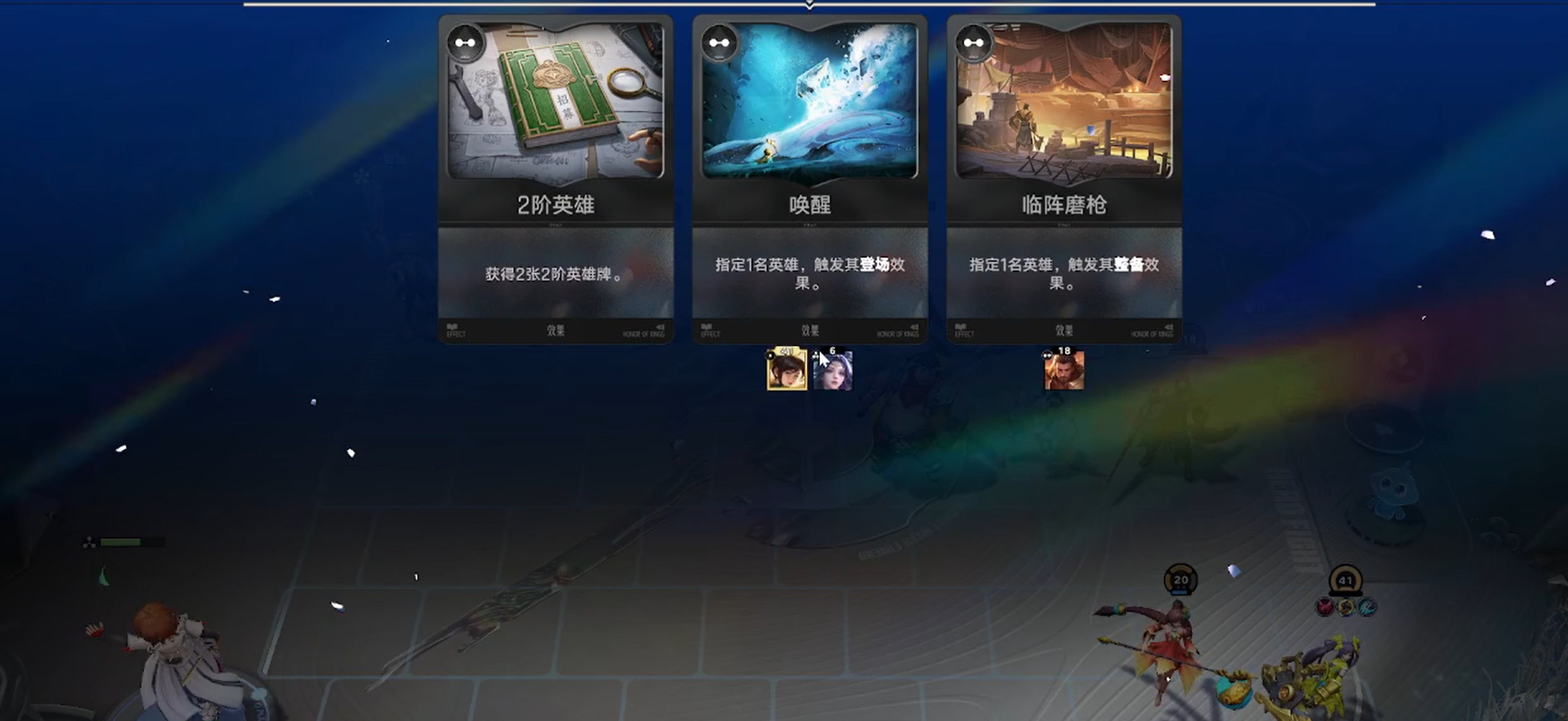 在途中每合成三次棋子会获得一张3选1效果牌,例如左边的2张二阶英雄就非常优质,就算没有拿到二阶三分英雄也能卖两点经济,关于效果牌的内容比较细节,我们列举几个好的选择供大家参考