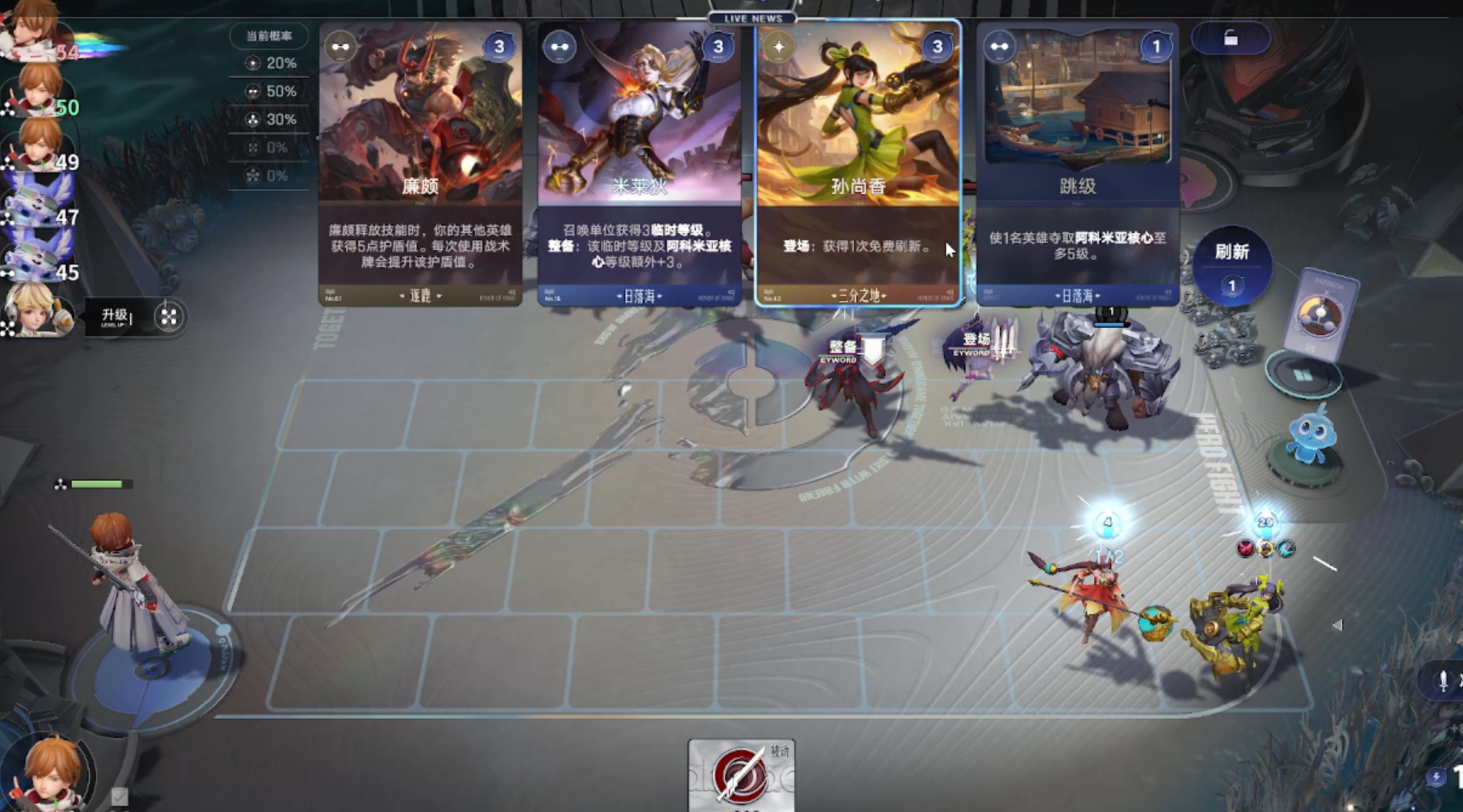 第三位就是我们三分1本的核心怪孙尚香,登场也就是打出时触发,获得一次免费刷新,这意味着在后面刷牌找核心时可以几乎无消耗找到,这也让三分阵容成型难度骤降。