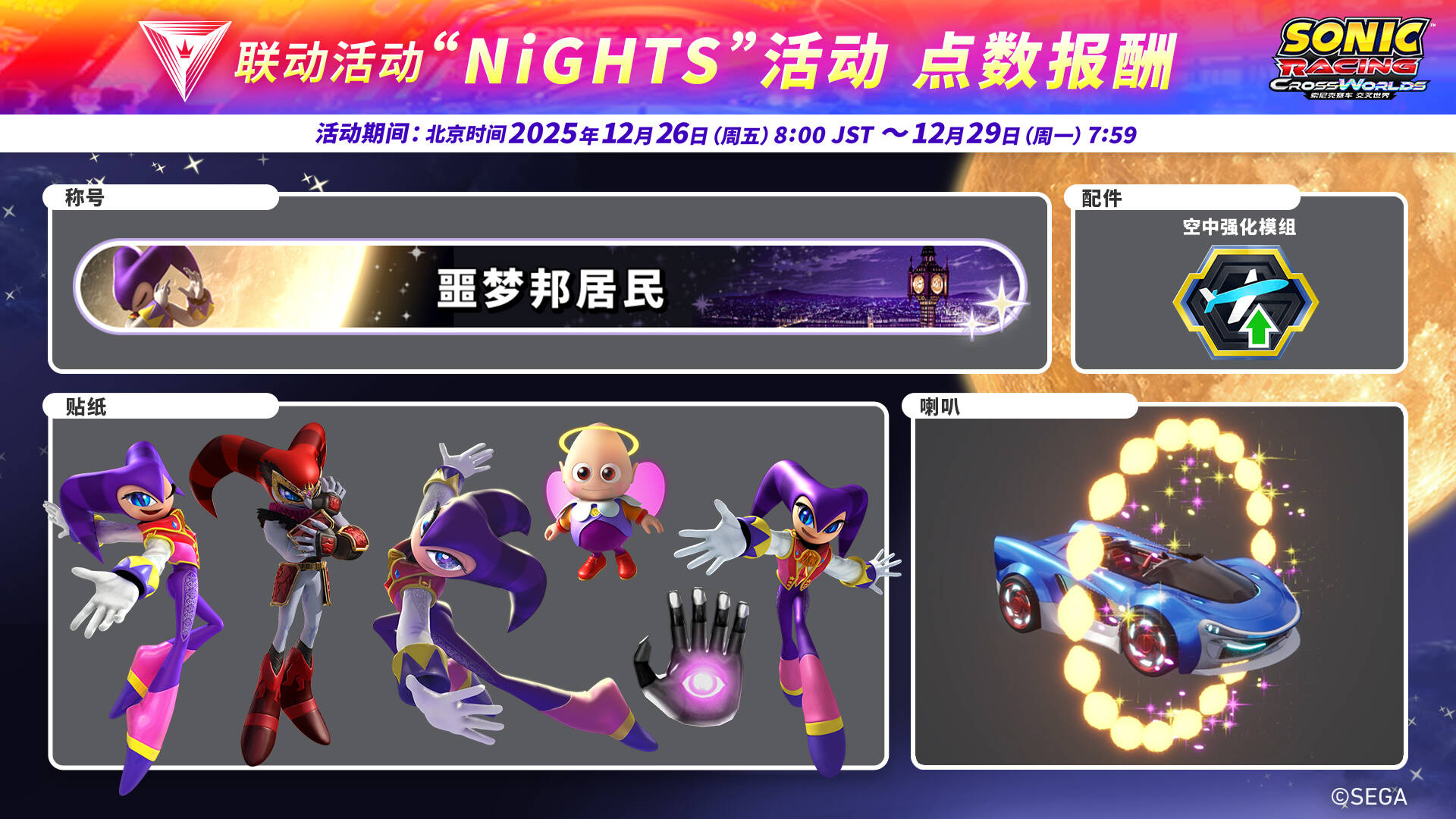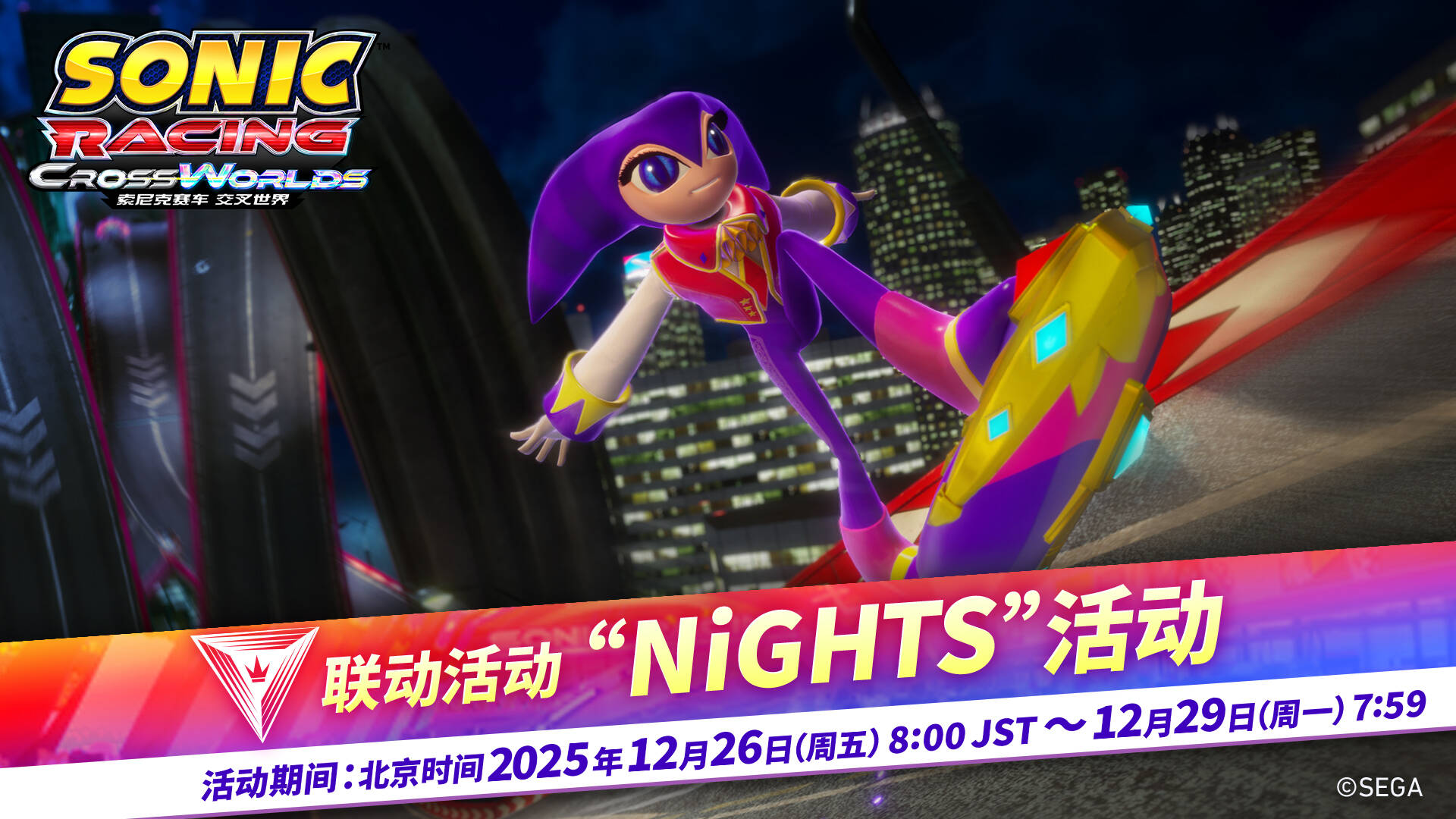 世嘉宣布,热销中的《索尼克赛车 交叉世界》已于今日(12月25日)正式发布免费更新内容“梦精灵(《NiGHTS》)”。游戏内还将于12月26日起限时举办“NiGHTS 活动”,活动期间内收集活动点数,可获得联动活动限定的特别版游戏内道具。