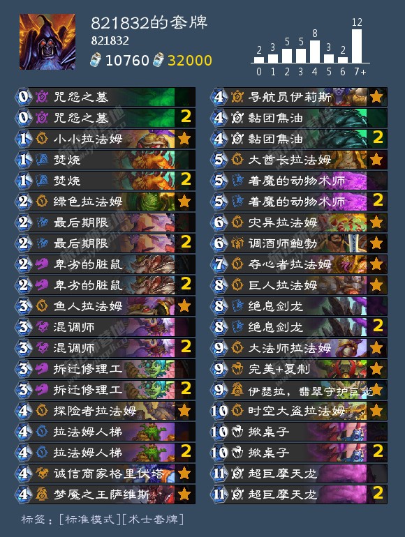 1.主要围绕着魔的动物术师构筑,现在主流卡组很少能处理摩天龙,为防止两张摩天龙射手,增加了剑龙,拉出来有嘲讽,有对随从的伤害。目的就是苟活住,毕竟控制术雷兽窟被削,星舰体系的防护水晶也被削,古树也被削,只能找其他体系。2.加入前期苟活混调师和焦油这两个基本防止前期血崩。3.橙卡四费三剑客,中立实用橙。4.脏鼠和拆标满编,没这两个别的OTK比你先启动,不就歇菜了啊。