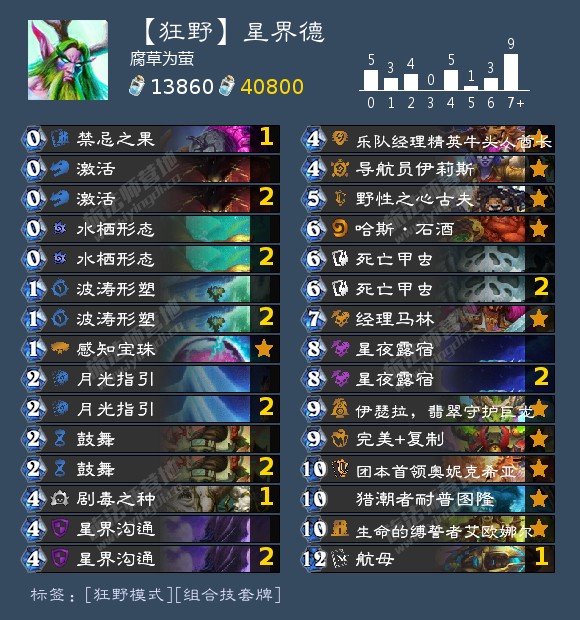 (2)跳到15费或以上后,尽快铺场,同时保留直伤(禁忌之果,死亡甲虫,航母,用导航员伊莉斯的10费enchantment复制死亡甲虫),争取快速斩杀对手。