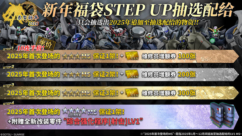 在 STEP4 中,保证获得1架2025年首次登场的 ★4 以上MS以外,再附赠全新改装零件「综合强化程序[射击] LV1」,请务必把握此机会!