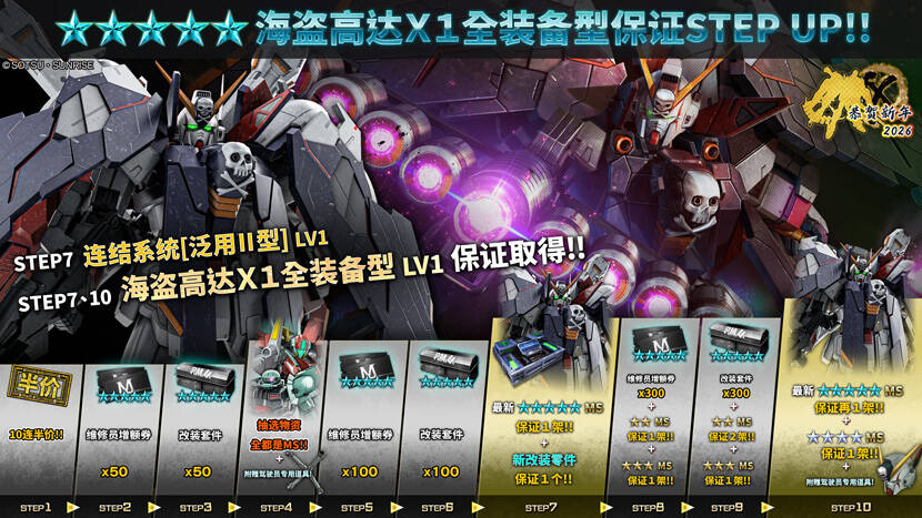在 STEP7 可确定获得1架「海盗高达X1全装备型 LV1」以外,再附赠新改装零件「连结系统[泛用Ⅱ型]] 」。此外,在 STEP10 中,还能再获得 1架「海盗高达X1全装备型 LV1」,并且再特赠「头套:X1全装备」,千万别错过这次入手全新★5 机体的机会!