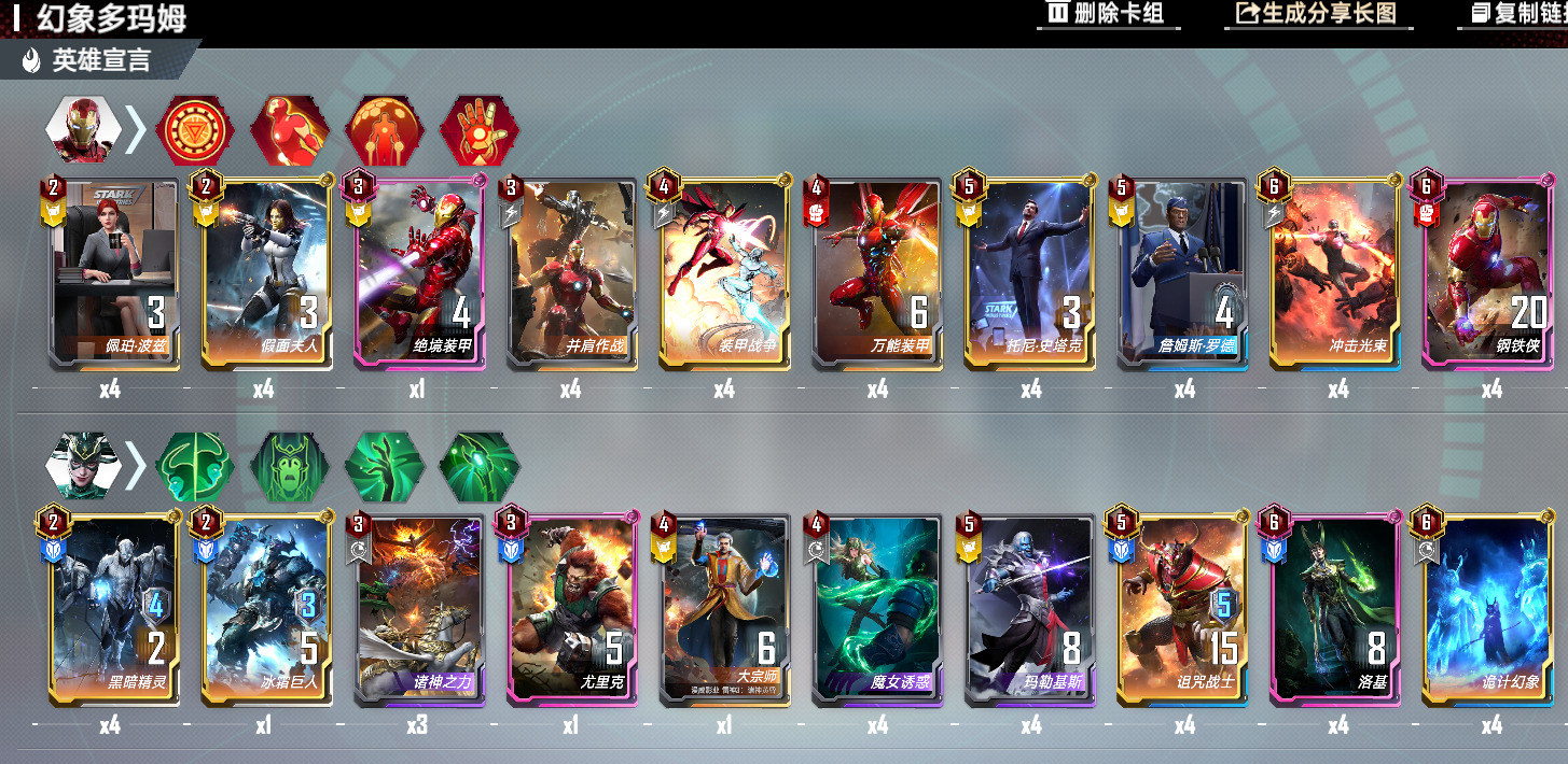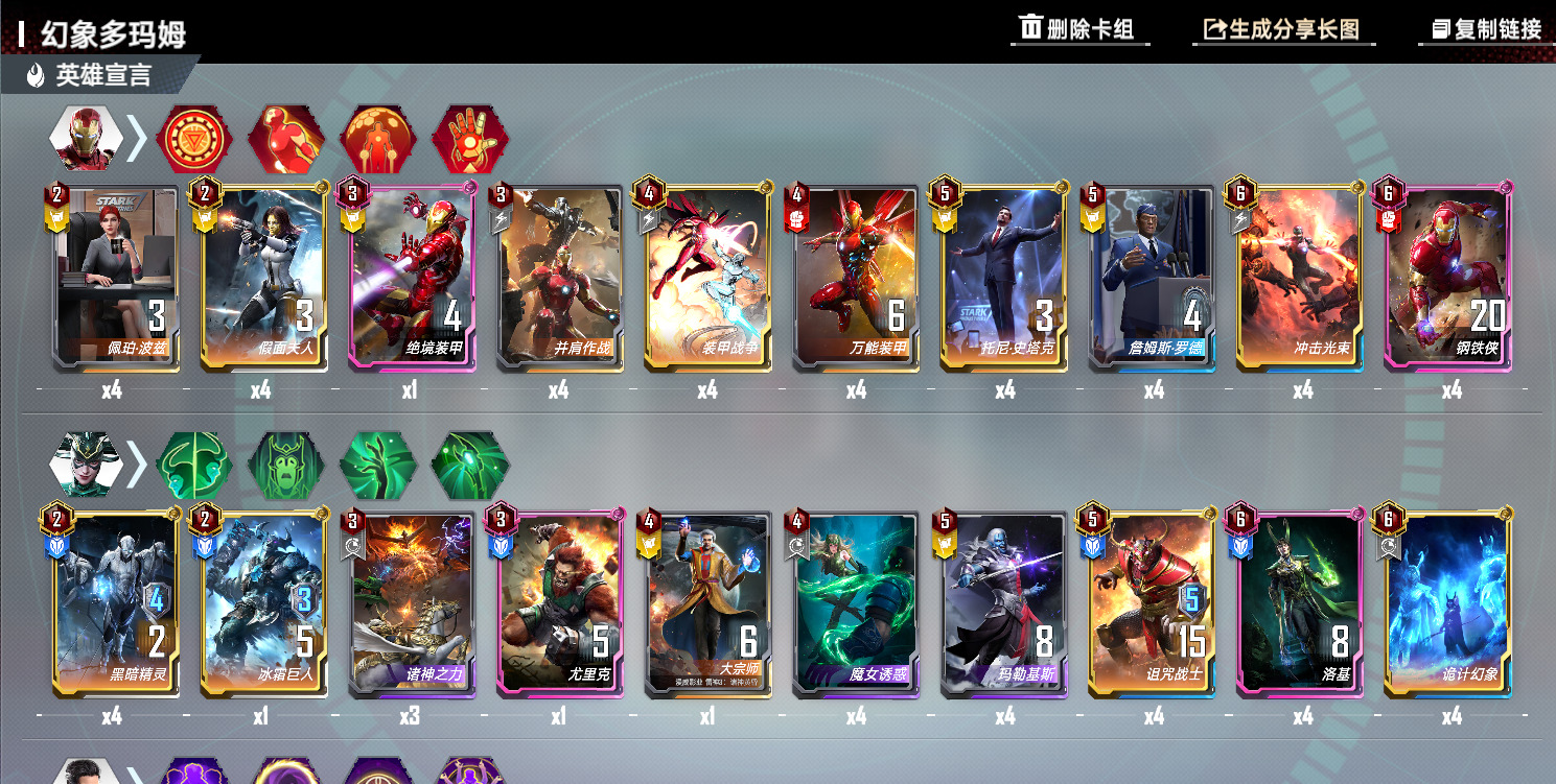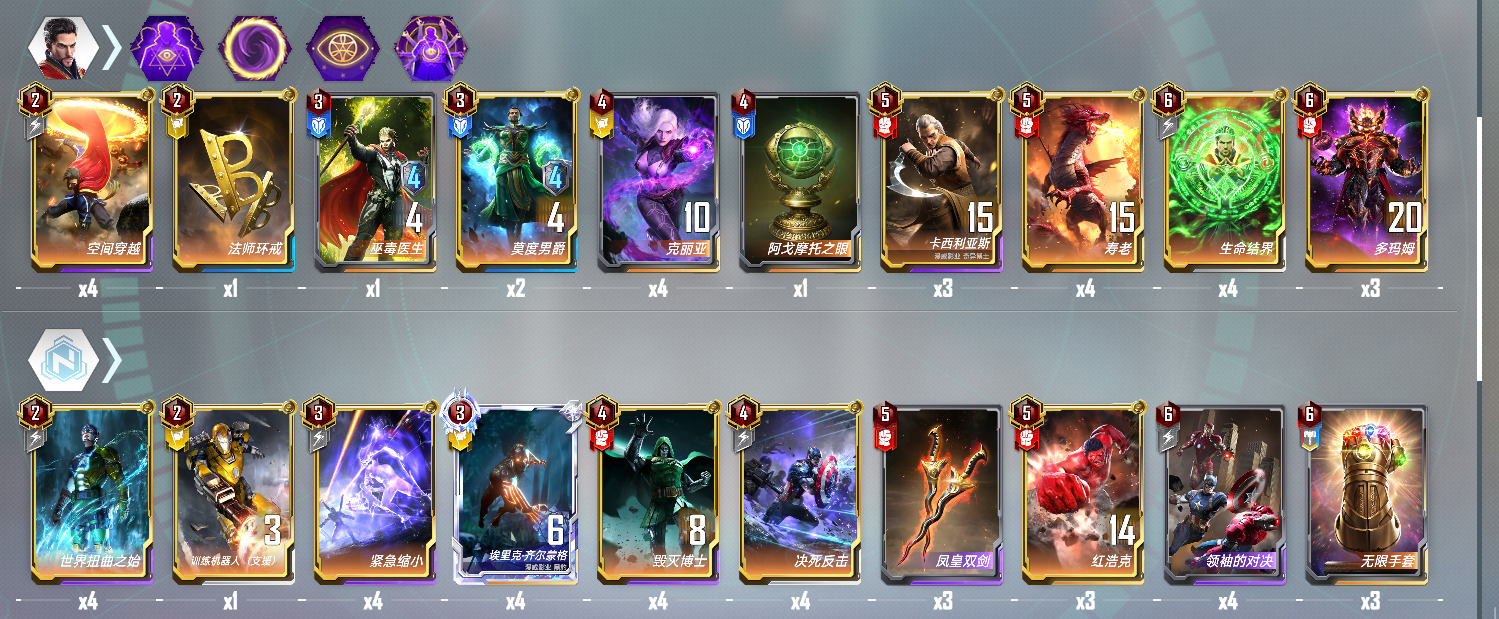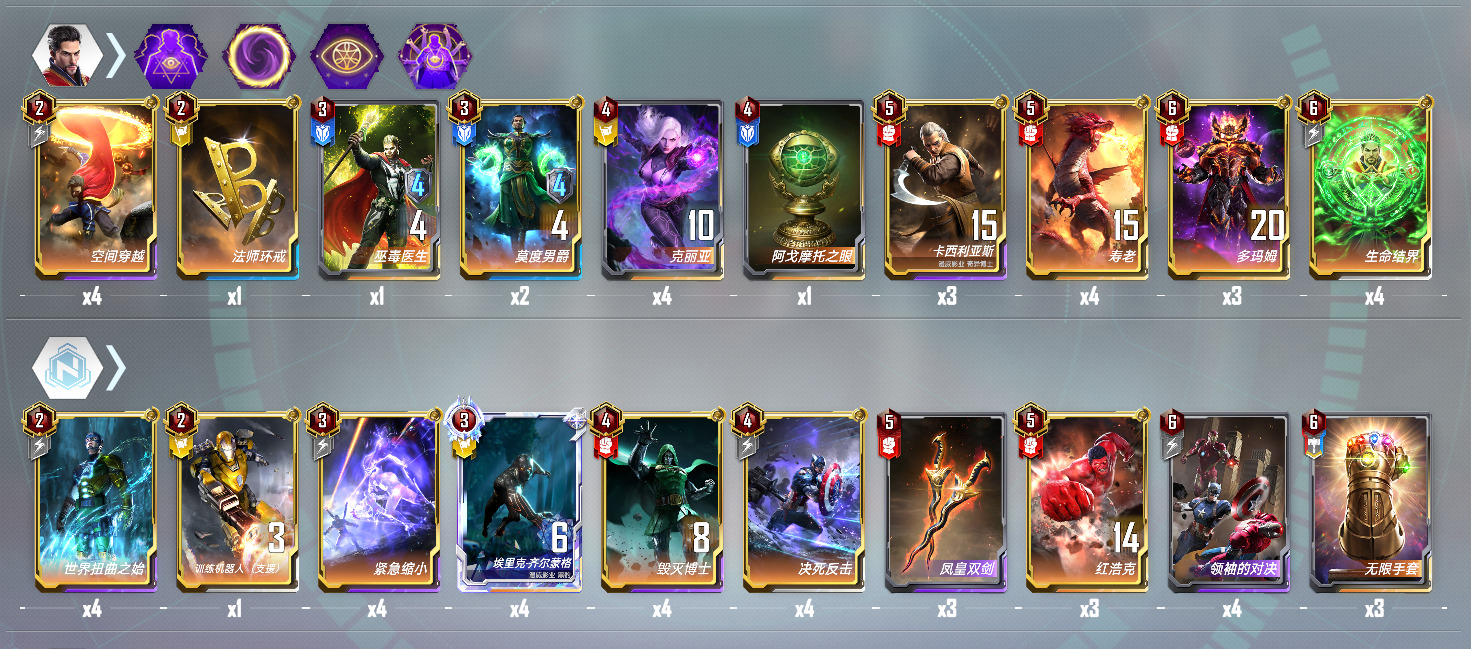 相比上一种 这套的经济更加宽裕 罗德过渡也更稳定一点 但个人还是更喜欢机器过渡 各有千秋 这套加上了铁人终幕 绝境 罗德 万能合星后 利用界钢 终幕 绝境来赚钱 一张绝境和四星绝境加上托尼链接吃双倍就可以做到每回合48+12=60块