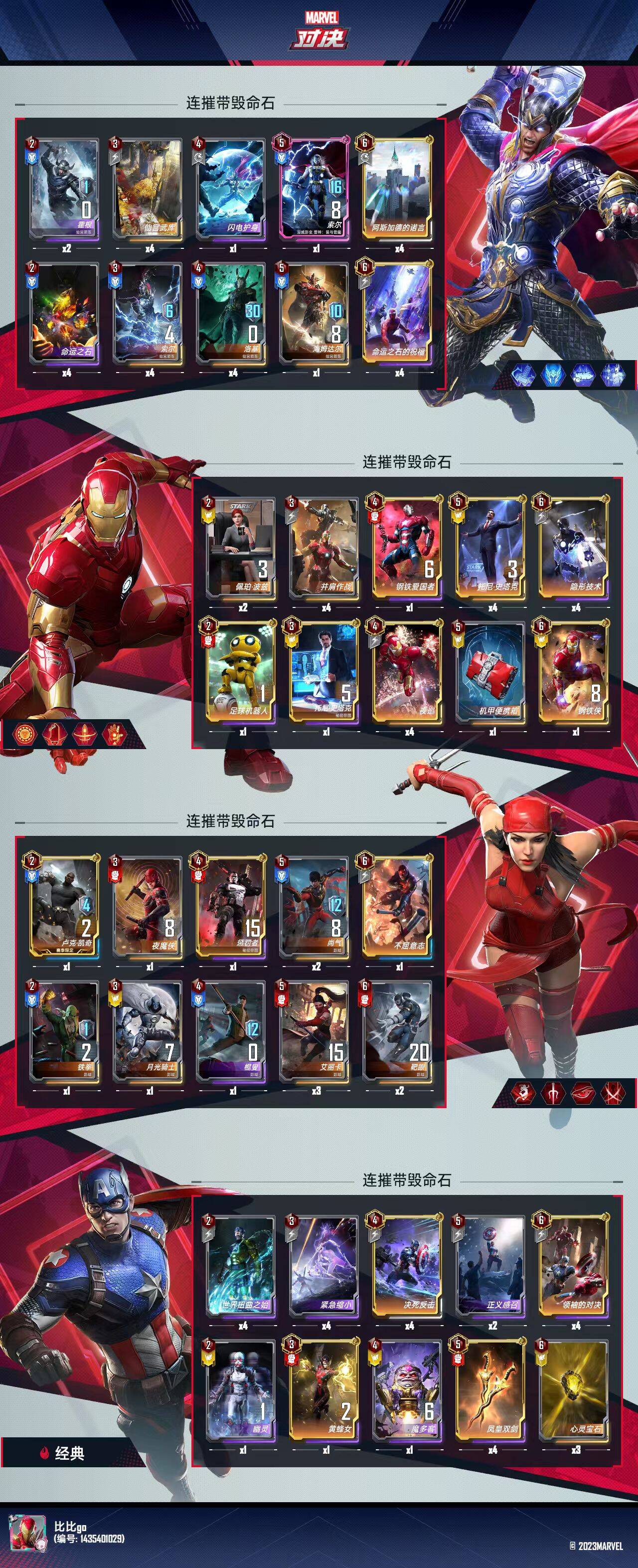 最后再说针对卡,①界索尔用来打内战摧毁对面索尔命石或者用来夜巡克制雷霆;②有蛇锁的话,可以用致狂炸弹和九头蛇或者钢铁侠解决一个角色,并配合洛基进行内战combo;③携带泽莫,其一是可以打过揭示;其二是夜巡防止摧毁索尔;④如果有需要,领袖对决可以换成与虚无对抗都是针对环境的卡。