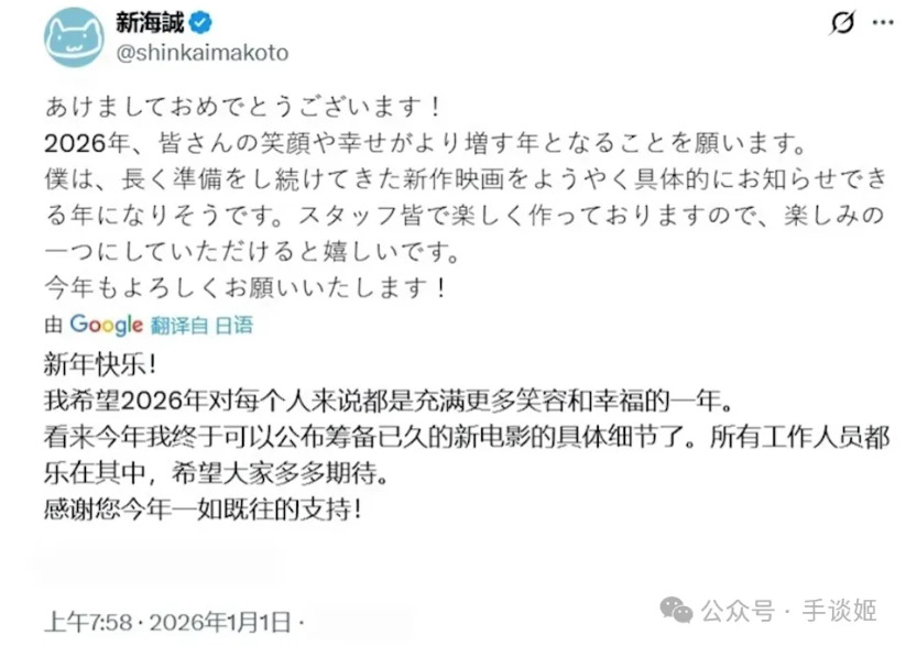 如果是比较关注新海诚的姬友们应该都已经知道了,就在元旦的时候新海诚在社交媒体发布了祝福的同时,也宣布将在今年正式公布筹备已久的新作品。于是乎手谈姬身边一些朋友直接炸锅,表示新海诚可算干活了,他自己的“三年之约”可都被打破了,这也太磨蹭了。