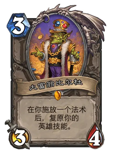 诶,大富翁比尔杜,在你释放一个法术后,复原你的英雄技能。帖主看到这张卡的时候眼前一亮,哇难道说?