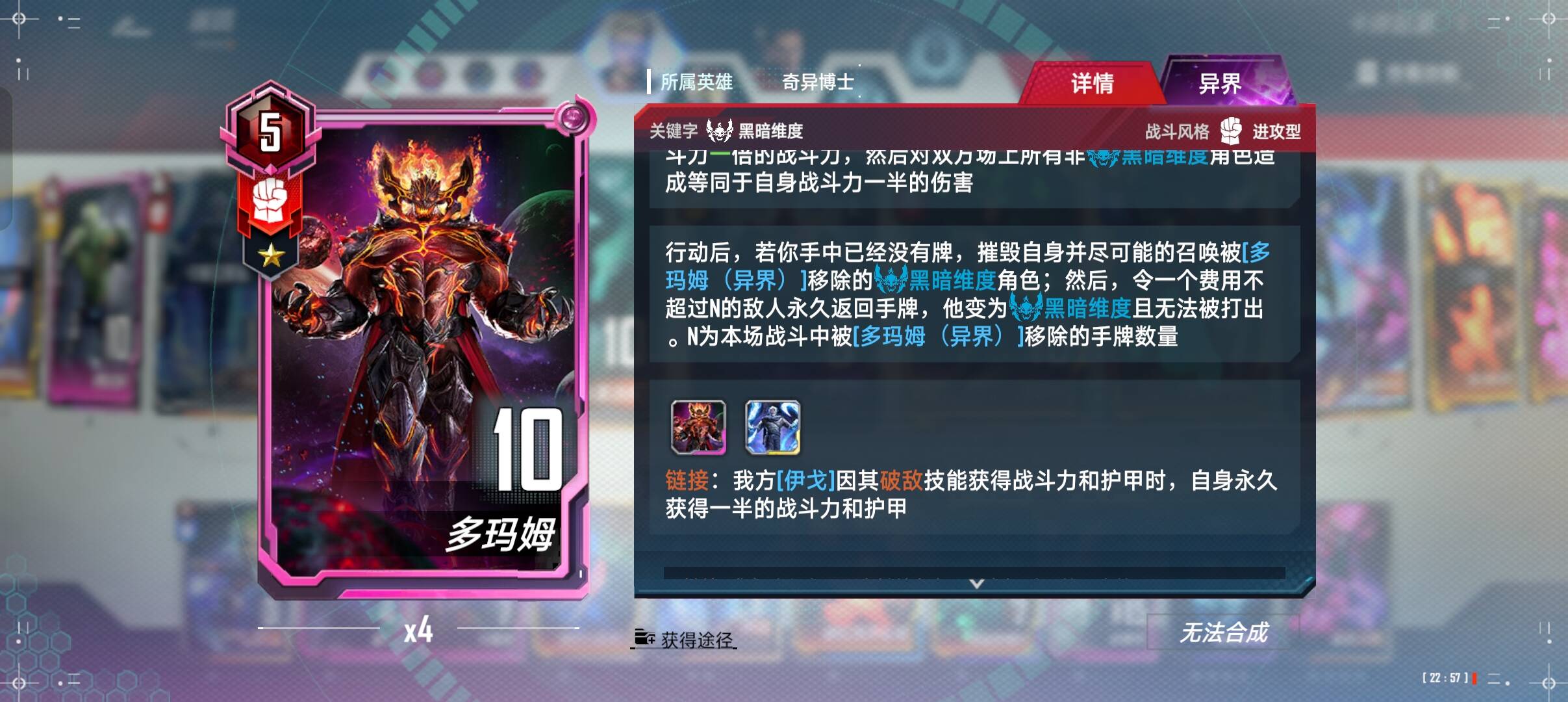 - 界多玛姆(五费):卡组最终核心,每次行动会摧毁敌方全场随从;通过 自身效果多次“吃掉”手牌维度卡,身材可叠至数千,并带来大量伤害。