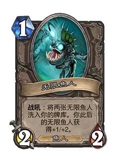 - 新:战吼:将两张无限鱼人洗入你的牌库。你此后的无限鱼人获得+1/+2。