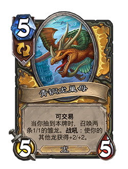 - 新:[5/5] 可交易。当你抽到本牌时,召唤两条1/1的雏龙。战吼:使你的其他龙获得+2/+2。