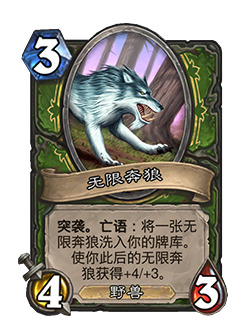 - 新:[4/3] 突袭。亡语:将一张无限奔狼洗入你的牌库。使你此后的无限奔狼获得+4/+3。